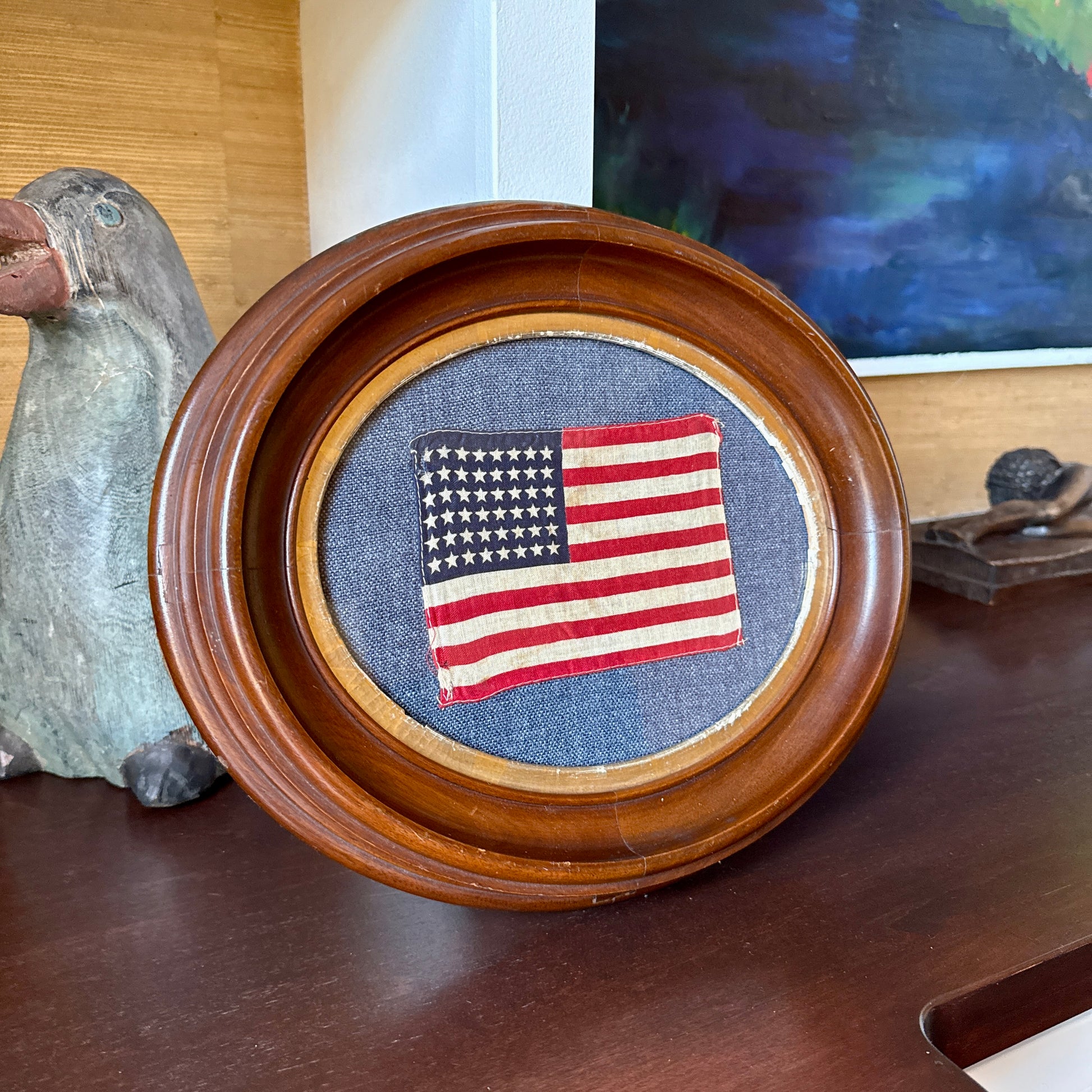 Old 48 star American flag mounted on a deep blue oxford fabric. Flag in a deep 19th century, oval wood frame with gilded inner liner measures 11.5" x 13.5". Under glass. Flag has great patina. Frame in good, antique condition with light scattered wear.