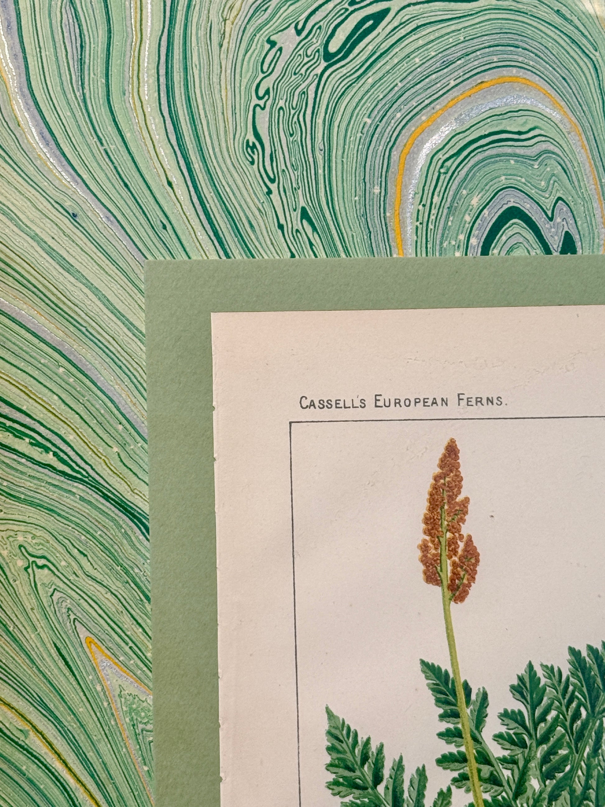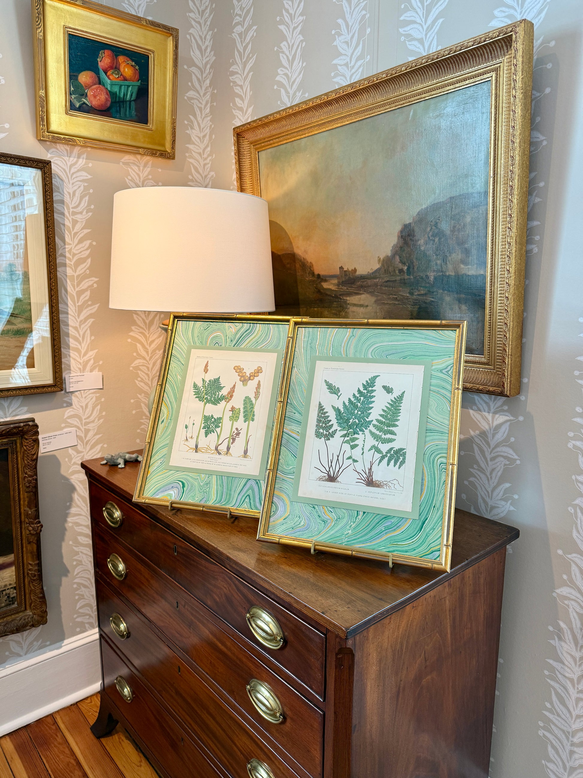 Pair of 19th Century Botanicals on Green Hand Marbled Mount in Gold Bamboo Frames