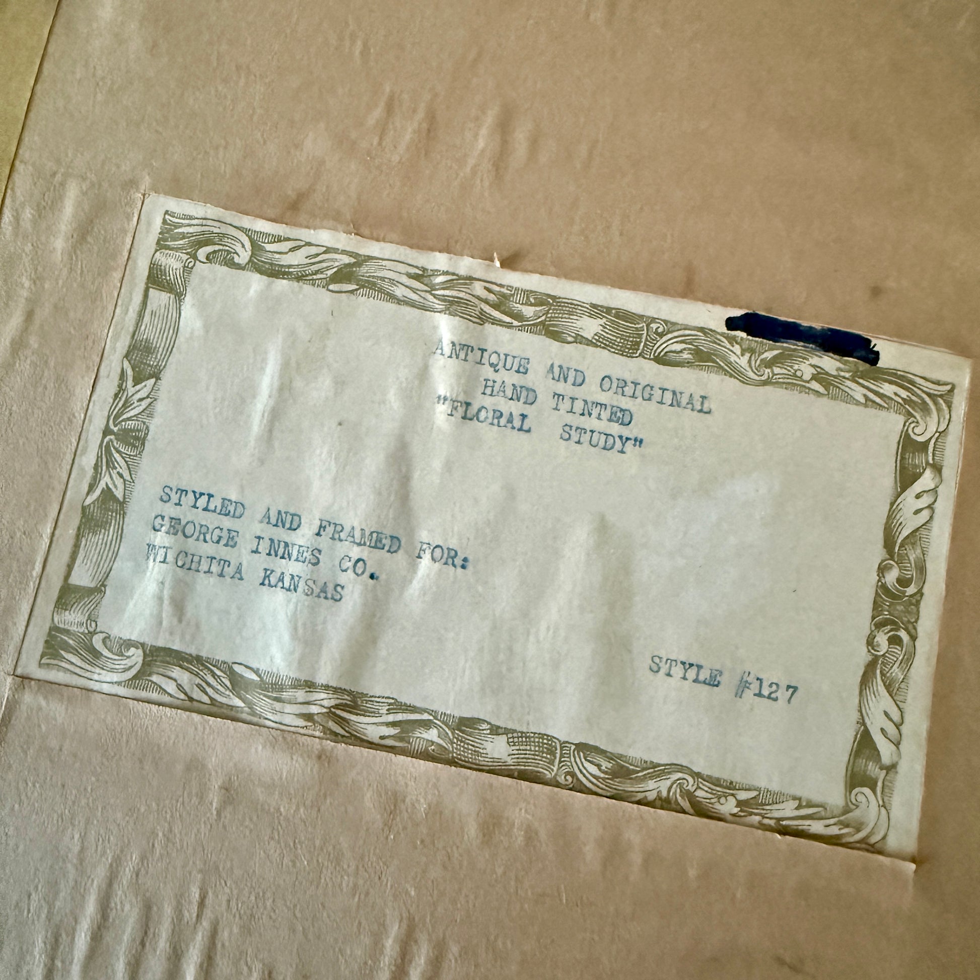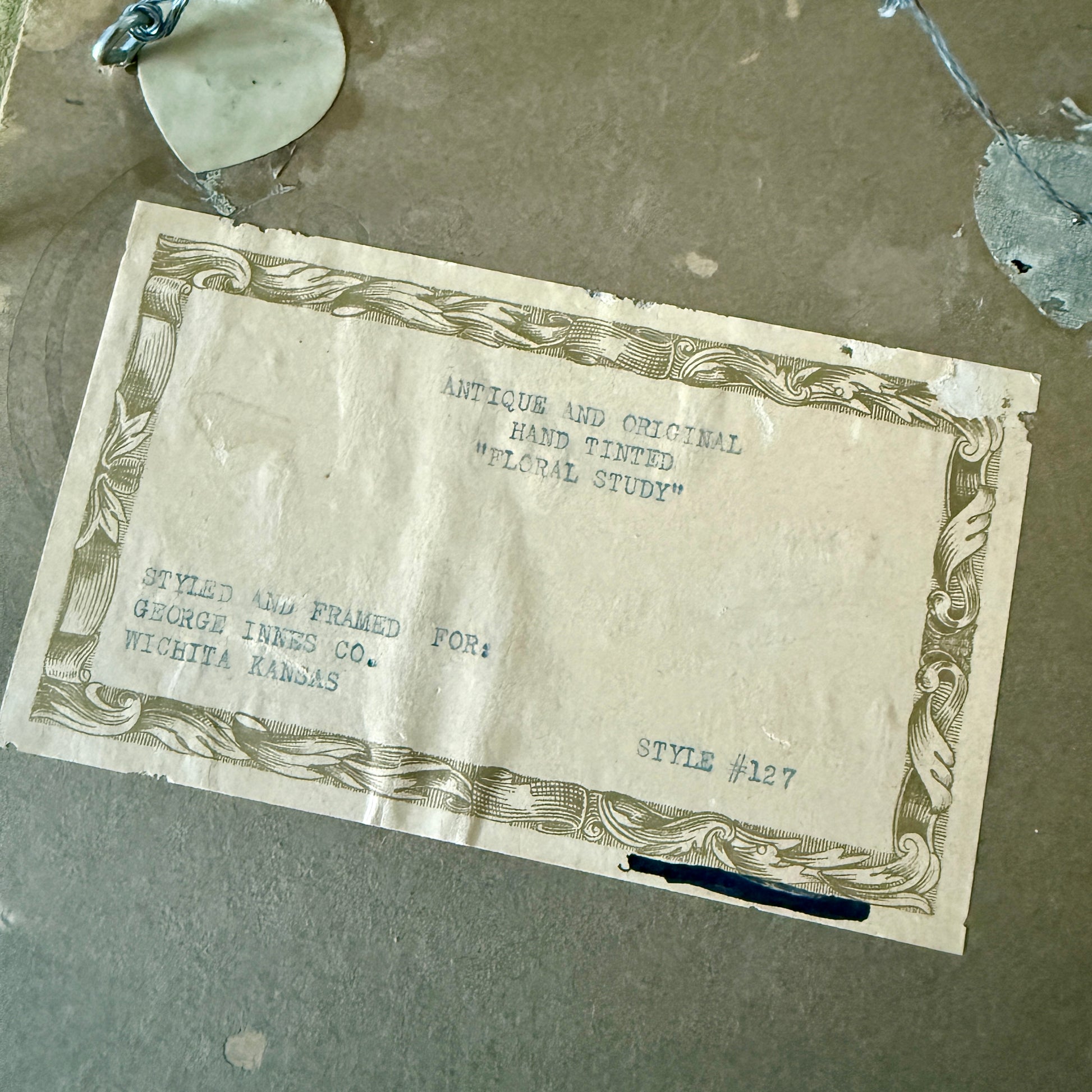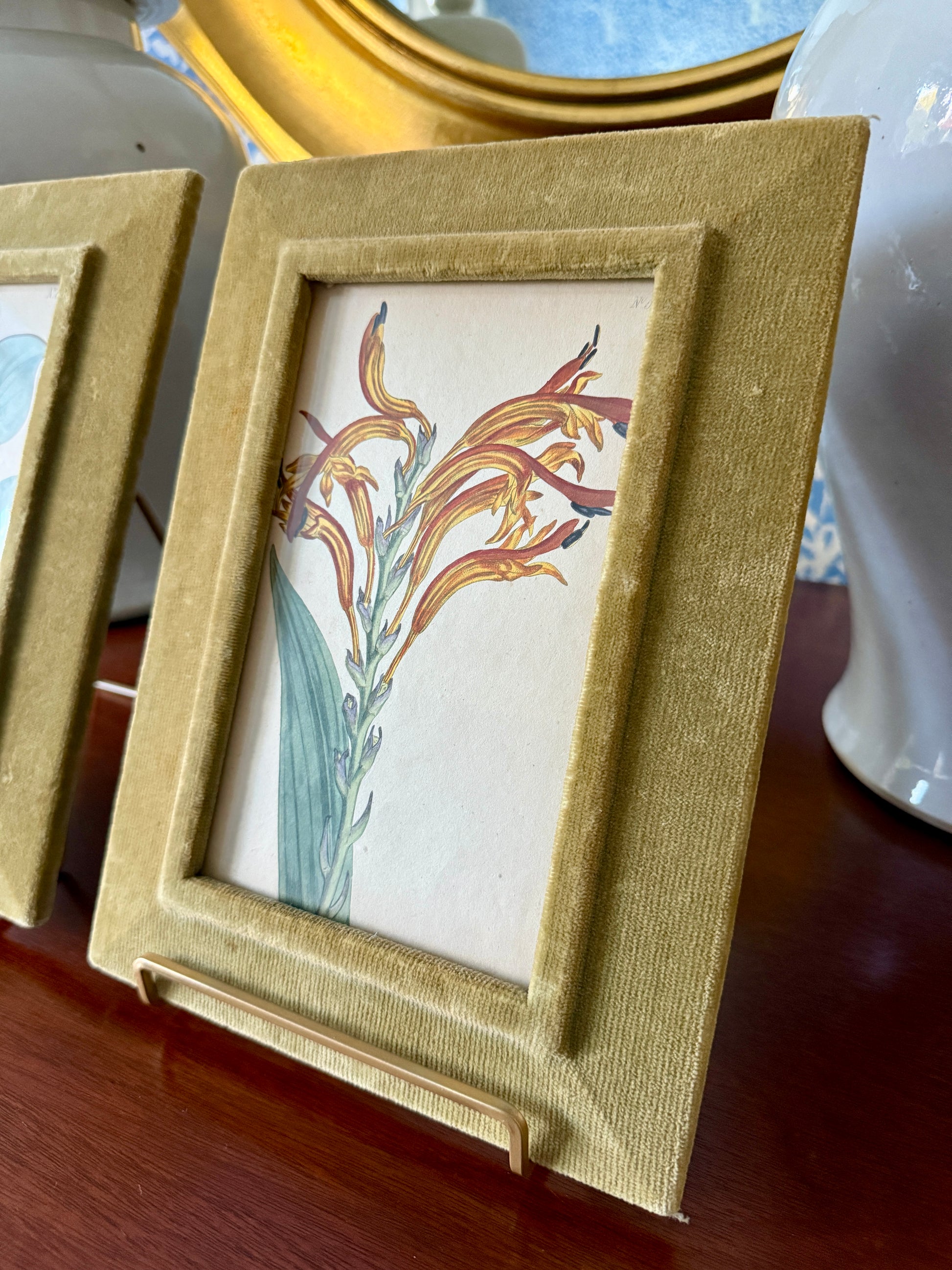 Set of two hand colored 19th century botanical engravings. Each engraving in an olive green velvet frame measures 11.25" x 8". Artwork in very good, age appropriate condition. Frames in good, age appropriate condition with scattered light markings to velvet.