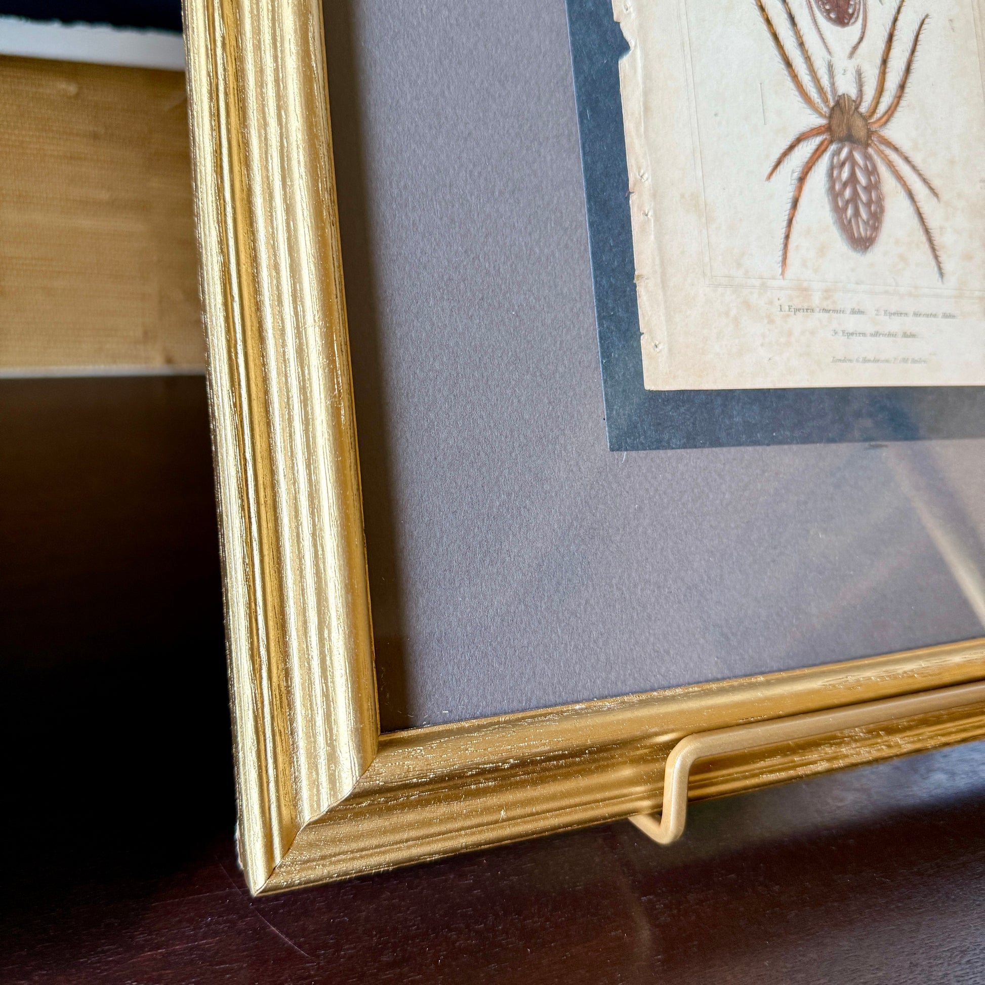 A pair of 19th century spider / arachnid hand colored lithographs from The Animal Kingdom: The Natural History of Animals by Brandon Cuvier. Mounted on tobacco brown matting. Artwork in vintage gold wood frames measure approximately 13" x 16" each. Artwork and frames in good, age appropriate condition with light wear.