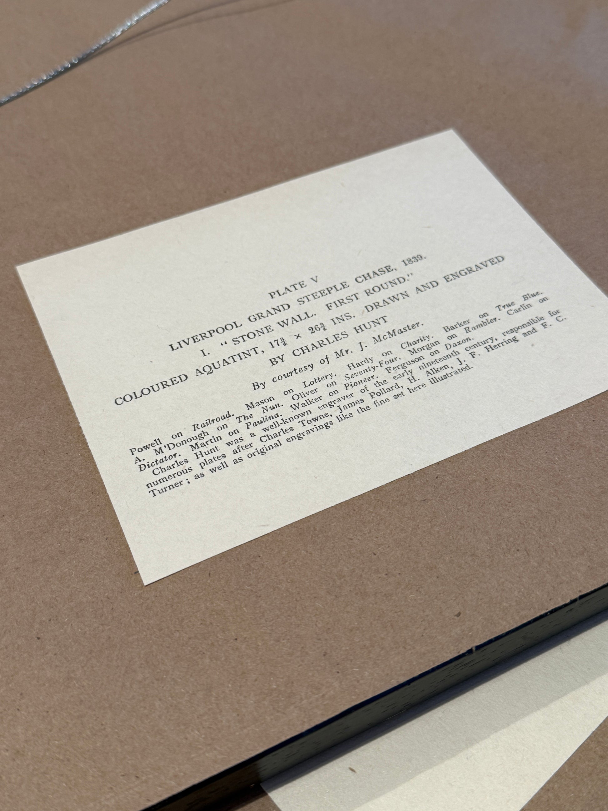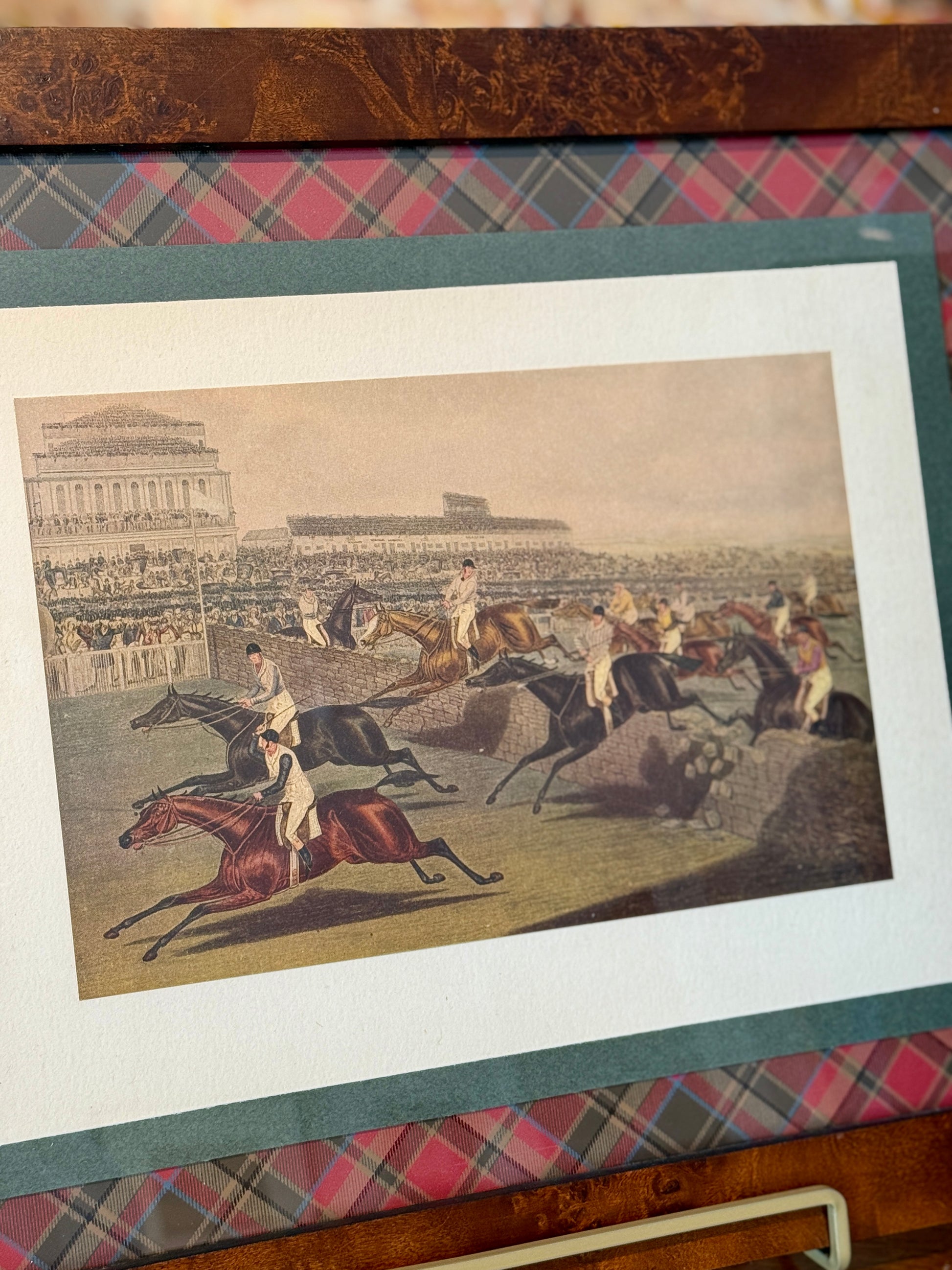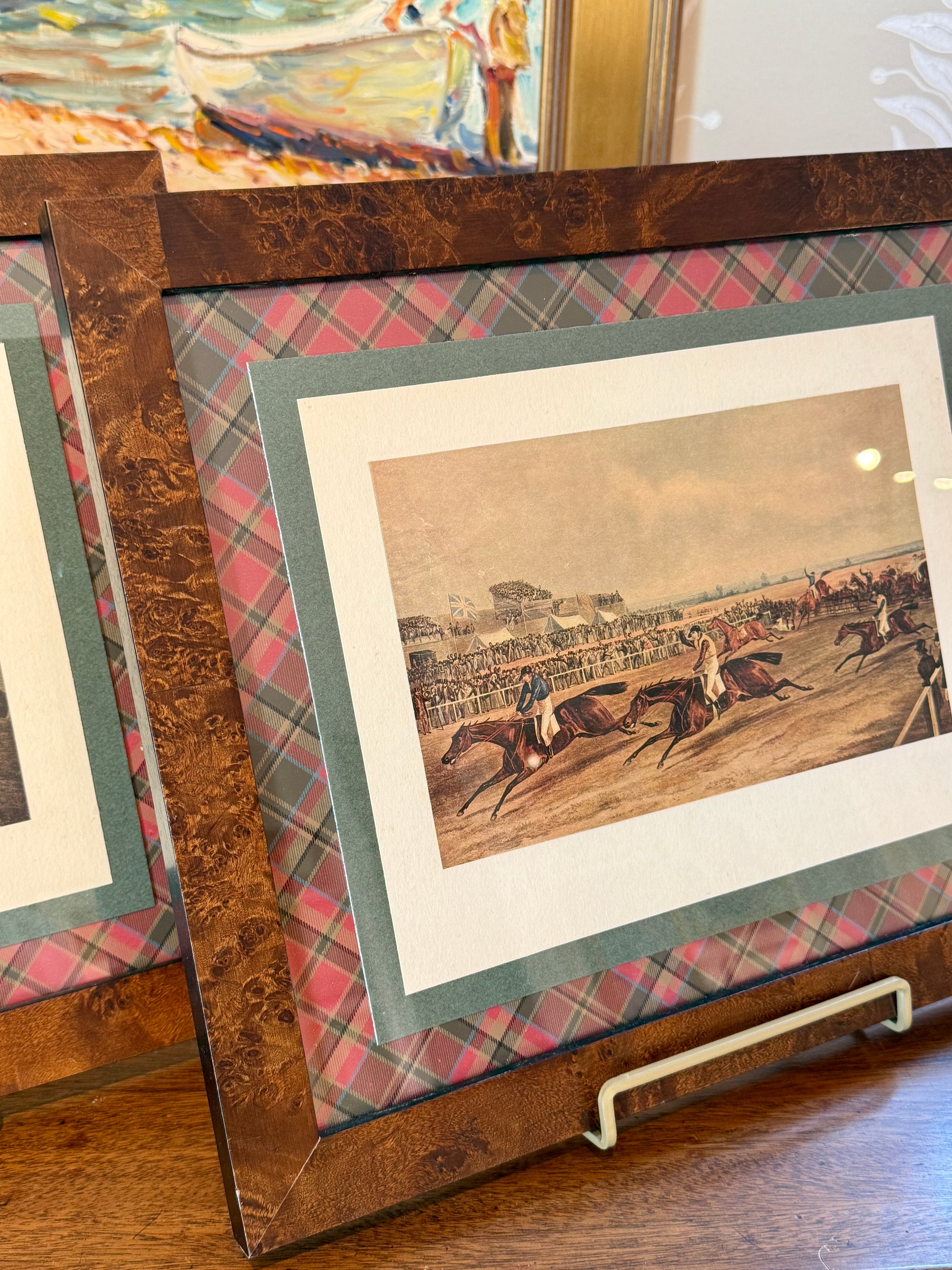 Pair of 19th Century 1839 Steeplechase Aquatint on Ralph Lauren Red Green Tartan Plaid in Burlwood Frames