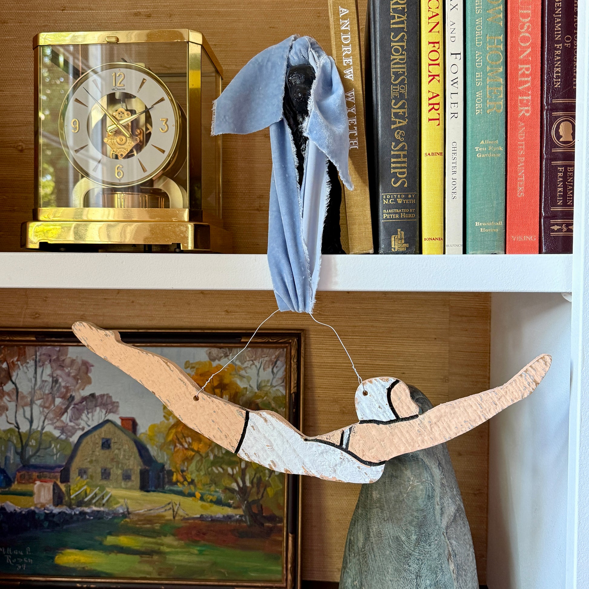 A Pennsylvania folk art wood carved and painted female swimmer in white bathing suit and cap. Hung on a thin metal wire with blue crushed velvet ribbon. Measures 16.25" in length. Very good condition.