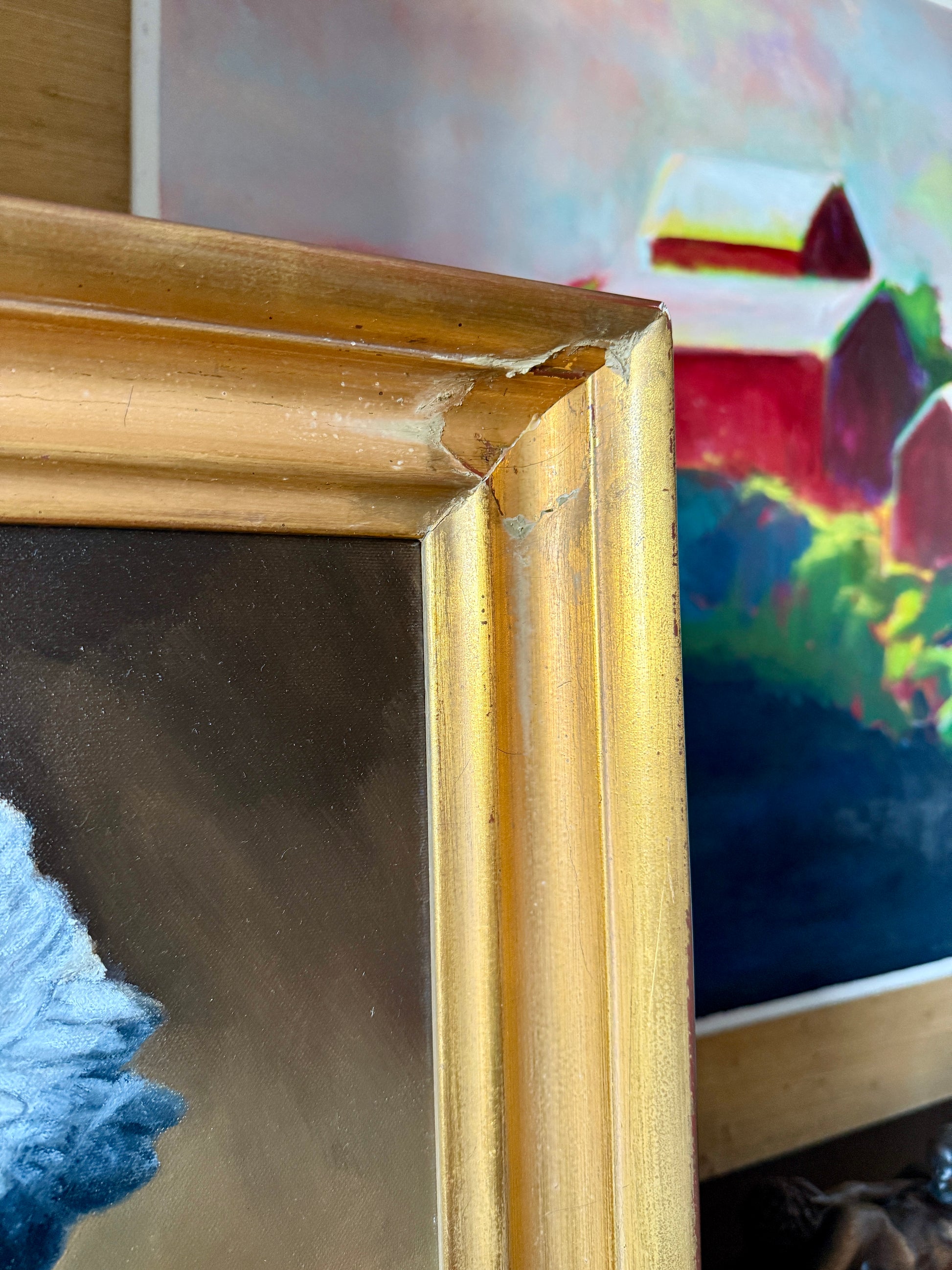 A regal, contemporary oil on canvas portrait of George Washington. Signed illegibly on the reverse. Artwork in perfectly-imperfect deep gilded wood scoop frame measures 24.5" x 20.75". Artwork in excellent condition. Frame shows overall scattered wear, including missing applied corner mouldings, but displays beautifully with the piece.