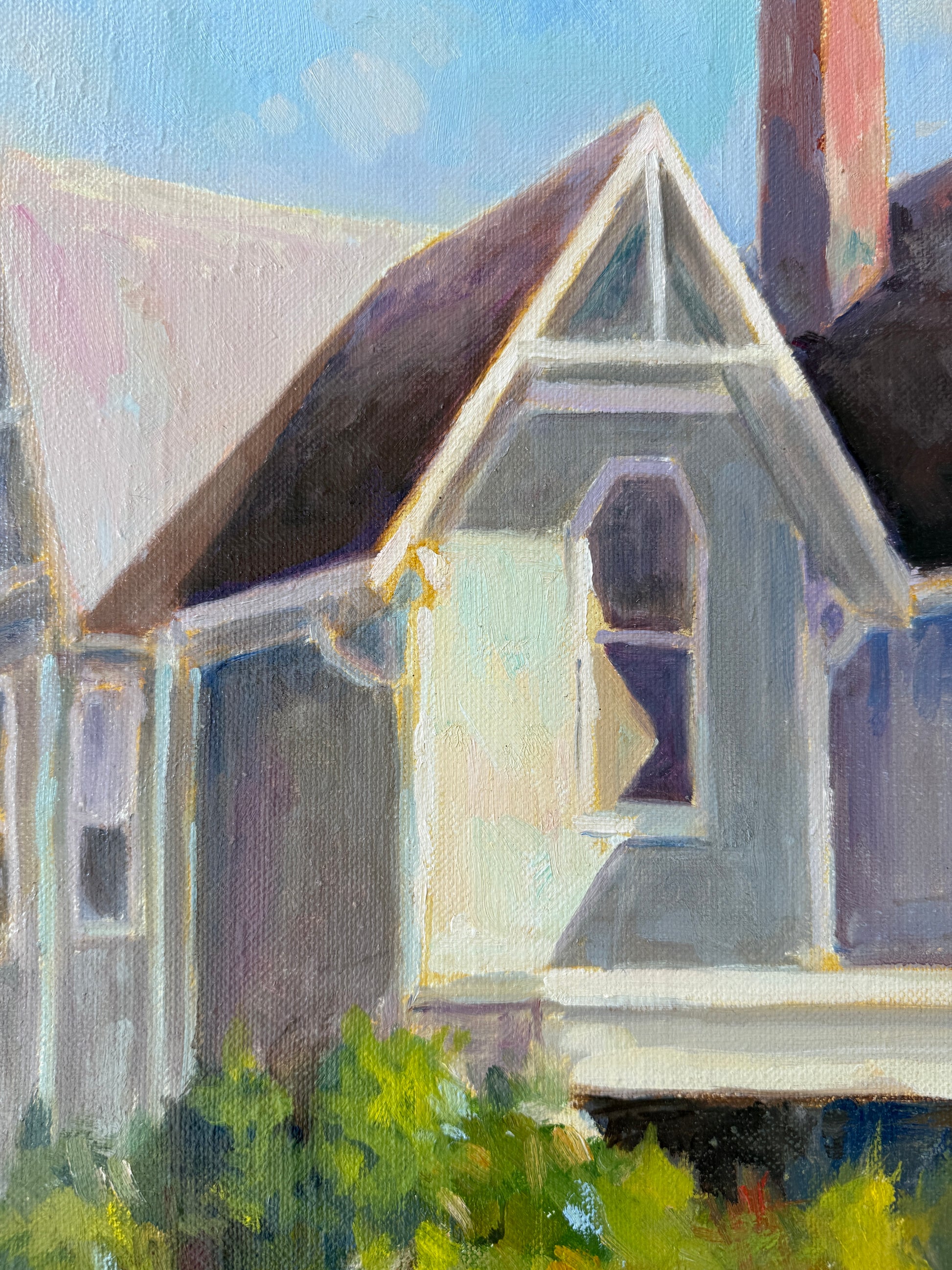 Ray Remo Gaietto (American, 20th century) oil on canvas portrait of a Victorian home in Gloucester or Rockport, MA. Signed and dated 1987 in upper right. Artwork in contemporary dark gold frame measures 23.5" x 19.5". Artwork and frame in very good condition.