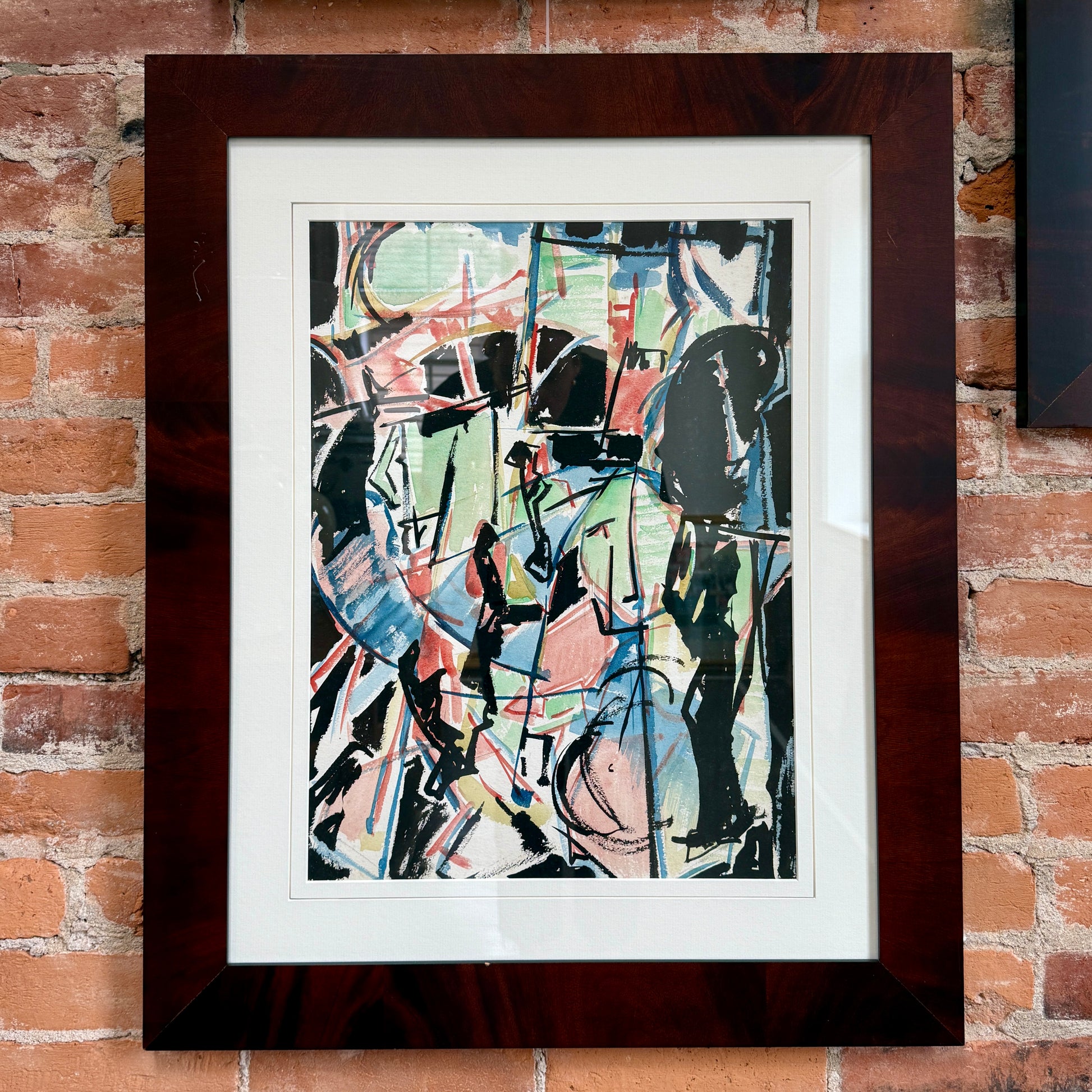Richard Derby Tucker (American, 1903-1979) color filled abstract gouache and watercolor painting titled Bouffant. Tucker was born in New York City in 1903, where he studied at the Art Students League and was later represented by the Frank Rehn Gallery. He was also a founding member of the Maine Coast Artists in Rockport. Artwork in beautifully grained, custom wood frame measures 28.25" x 23.25". No visible signature, from a collection of works by the artist. Artwork and frame in very good condition with light wear including a shallow scratch to left side. Coordinating artwork shown available in separate listings.