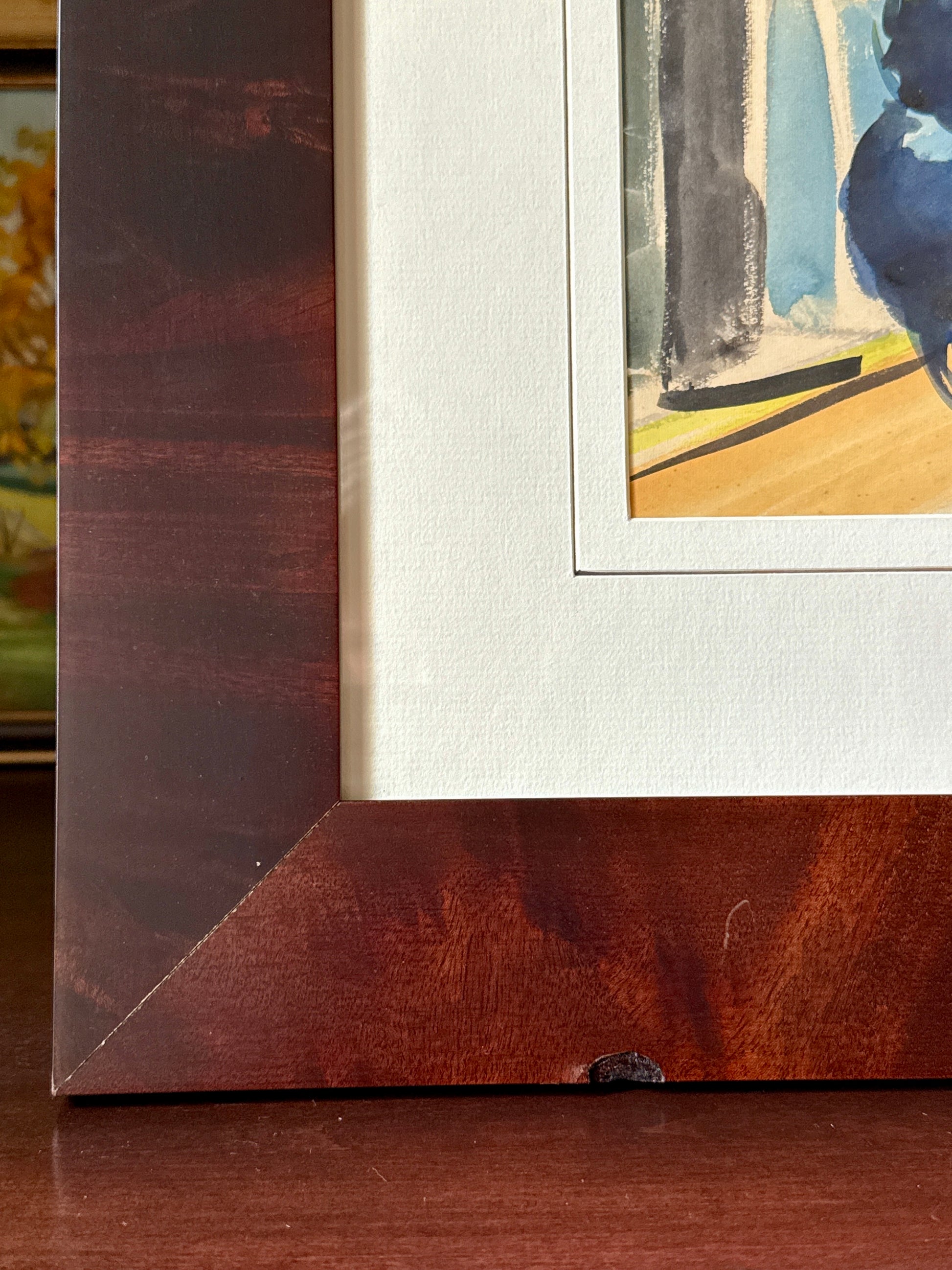 Richard Derby Tucker (American, 1903-1979) color-filled abstracted still life watercolor painting. Tucker was born in New York City in 1903, where he studied at the Art Students League and was later represented by the Frank Rehn Gallery. He was also a founding member of the Maine Coast Artists in Rockport. Artwork and beautifully grained, custom wood frame are in very good condition with light wear including one small touched up chip at the bottom edge. Coordinating Tucker artwork shown in last photo is available in a separate listing.