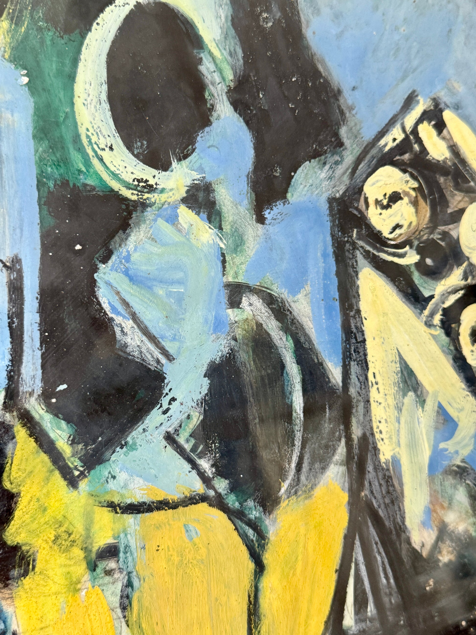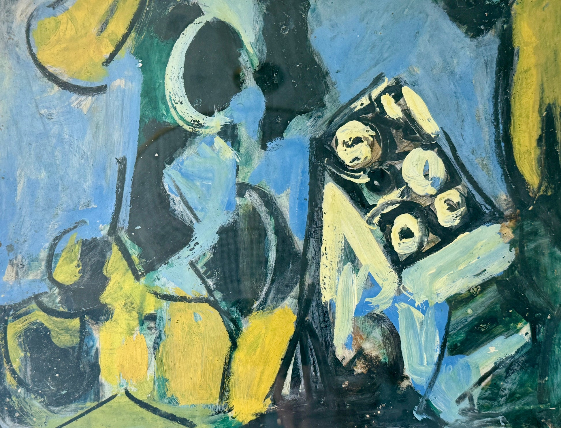Richard Derby Tucker (American, 1903-1979) brilliantly color filled abstract painting. Tucker was born in New York City in 1903, where he studied at the Art Students League and was later represented by the Frank Rehn Gallery. He was also a founding member of the Maine Coast Artists in Rockport. Unsigned. Artwork in custom gold frame measures 17.5" x 20.5". Artwork and frame in very good condition with light wear. Coordinating Tucker artwork is available in a separate listing.