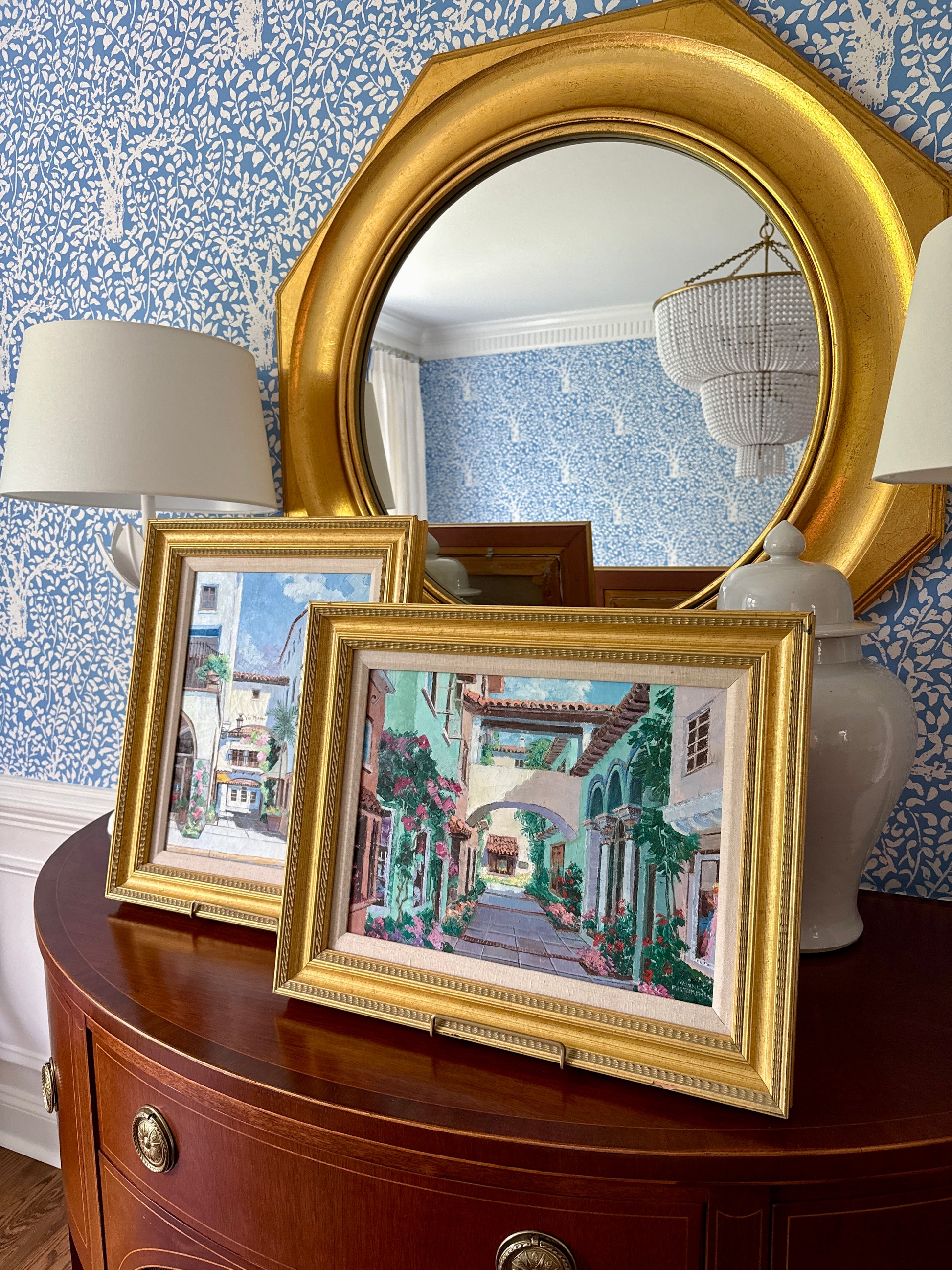 Ronni Pastorini (American, 1915-2011) oil on canvas detailed depiction of a bougainvillea-covered Palm Beach shopping scene. Signed Ronni Pastorini. Artwork in detailed, custom, gold wood frame measures 17" x 21". Artwork and frame in very good condition with light wear. Coordinating artwork shown in last photo is available in a separate listing.