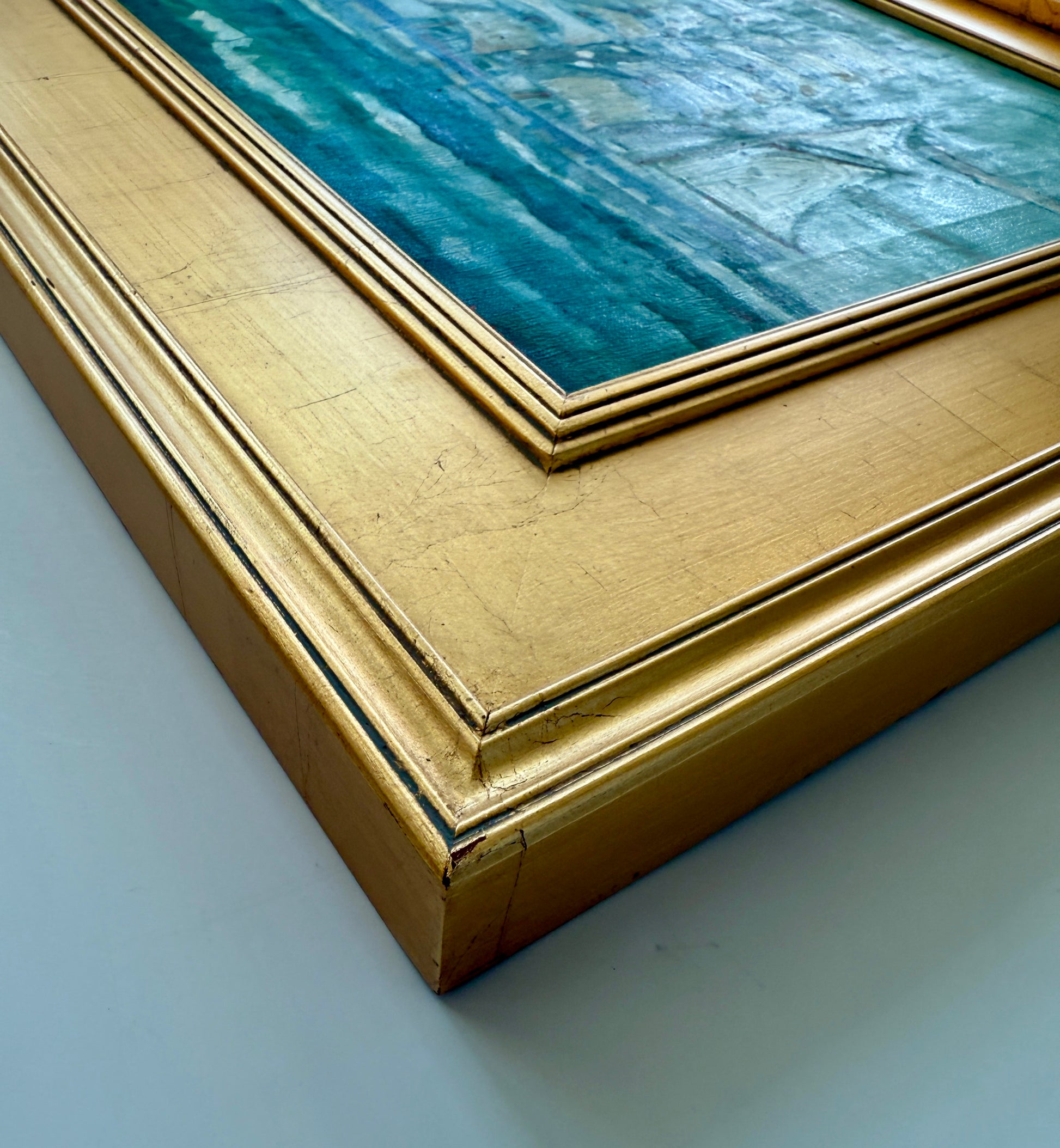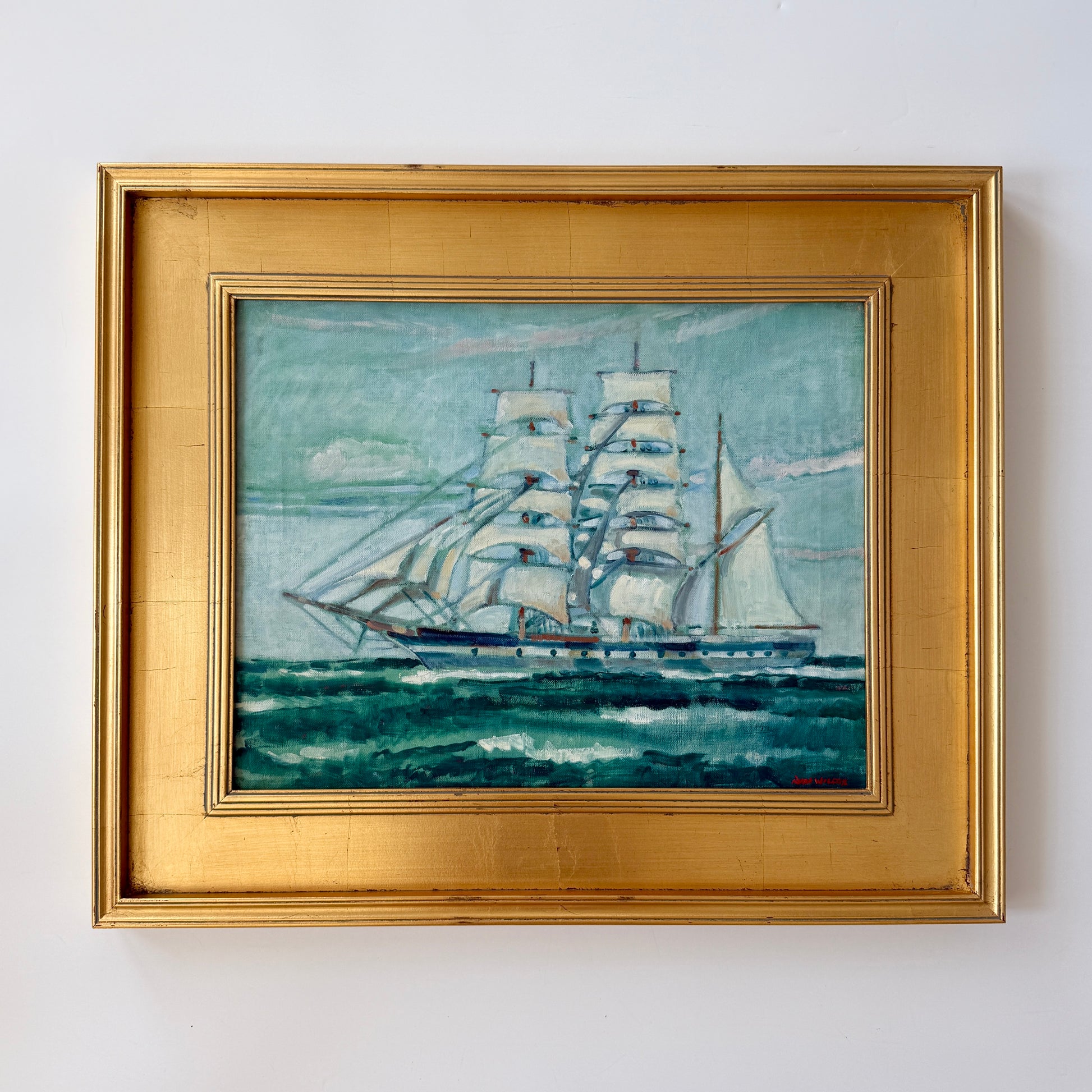 Ruth Dawes Wilcox (American, 1908-1989) mid century American ship portrait oil painting on canvas. Wilcox was the daughter of artists Ray Wilcox and Ruth Turner Wilcox, fashion illustrator and fashion editor of Women's Wear Daily from 1910-1915. Artwork in contemporary gold wood frame measures 20.75" x 24.75". Signed lower right. Artwork and frame in very good condition. Coordinating works by Wilcox shown in last photo are available in separate listings.