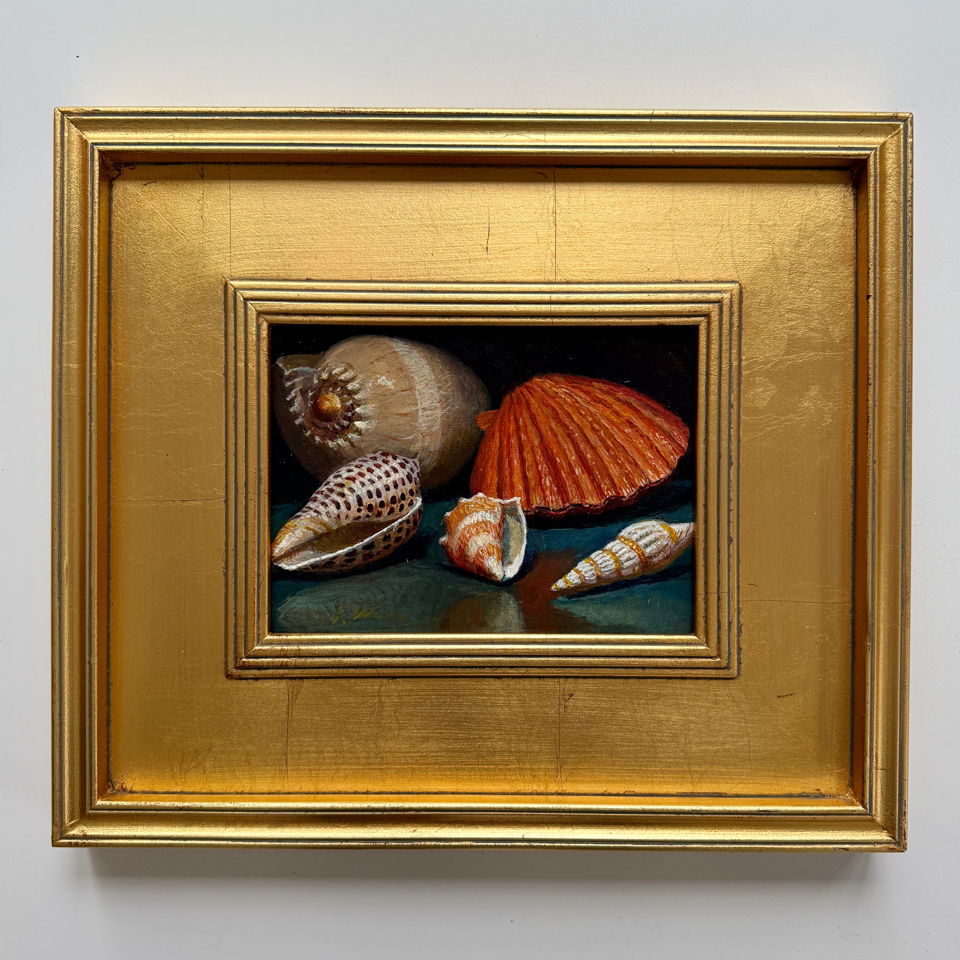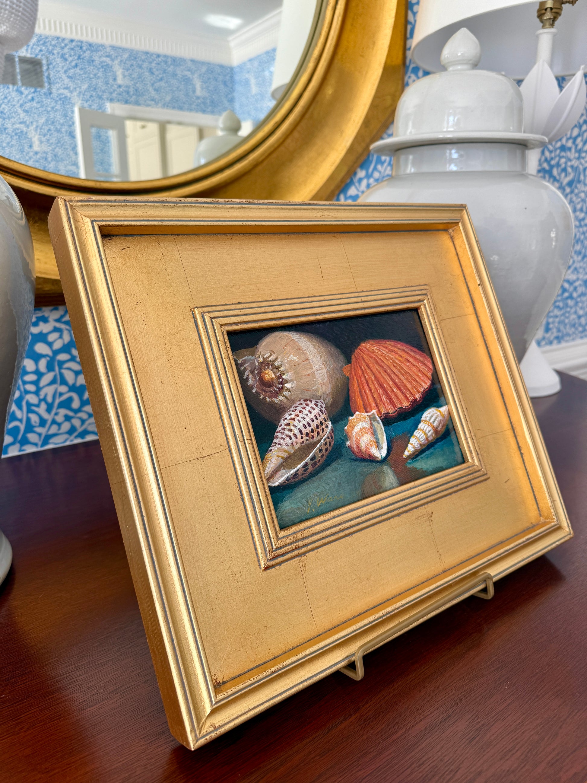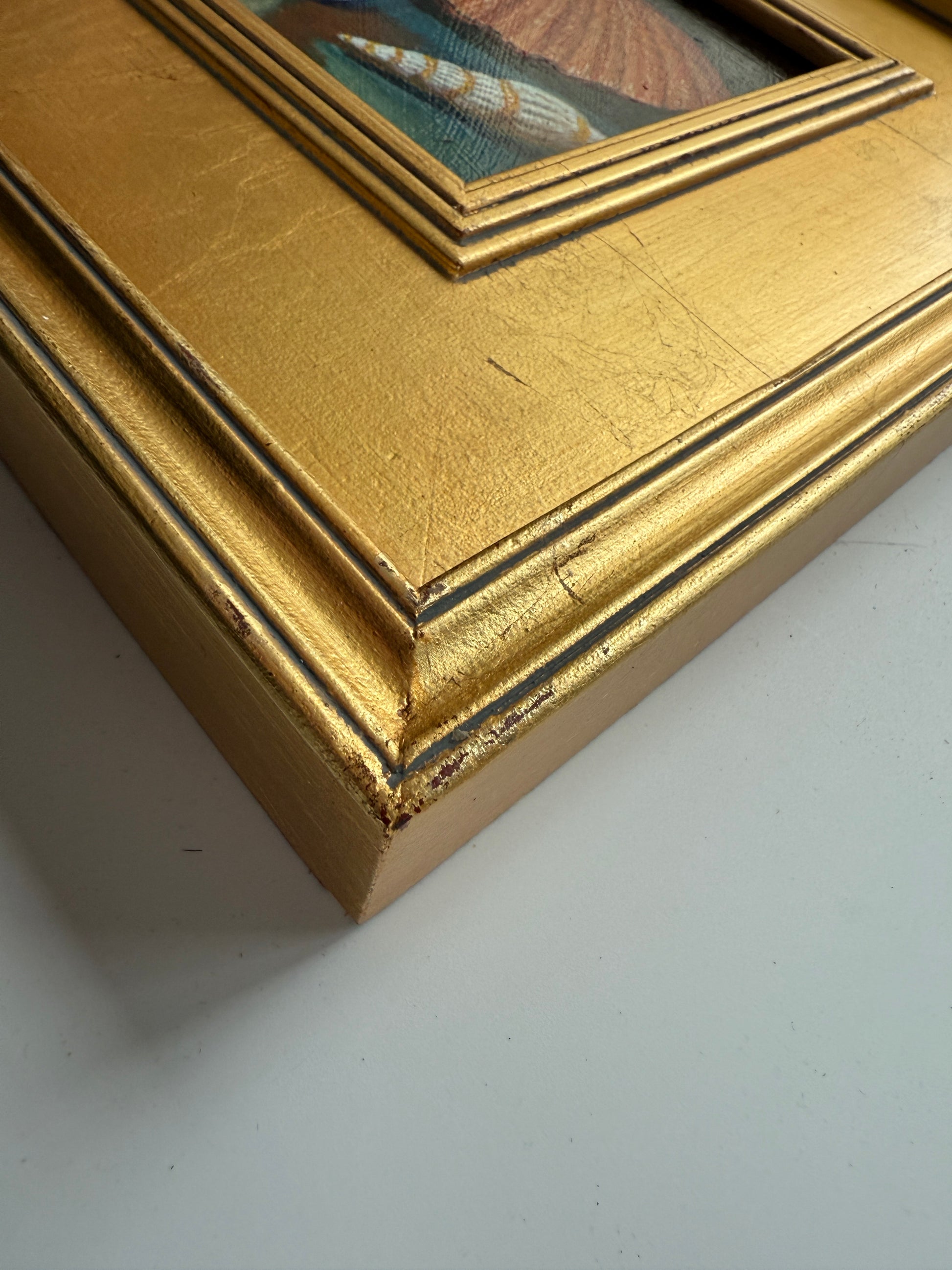 Nautilus Cowrie Scallop Seashells Still Life Oil Painting in Gold Frame