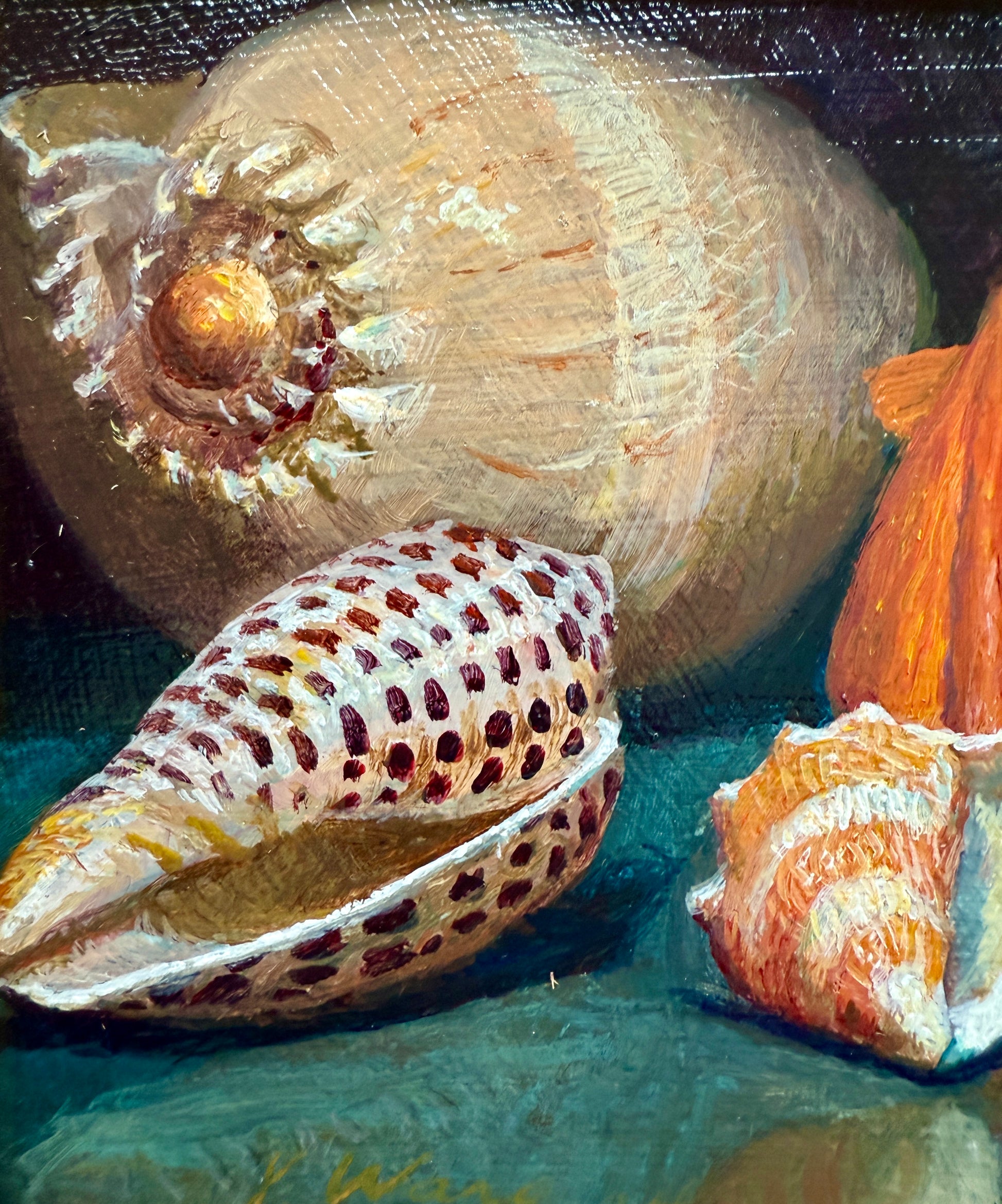 A contemporary, finely done oil painting on board still life of a variety of seashells to include a nautilus, cowrie and scallop shell, among others. Signed lower left. Artwork and gold solid wood frame measures 12.5" x 14.5". Artwork and frame in very good condition.