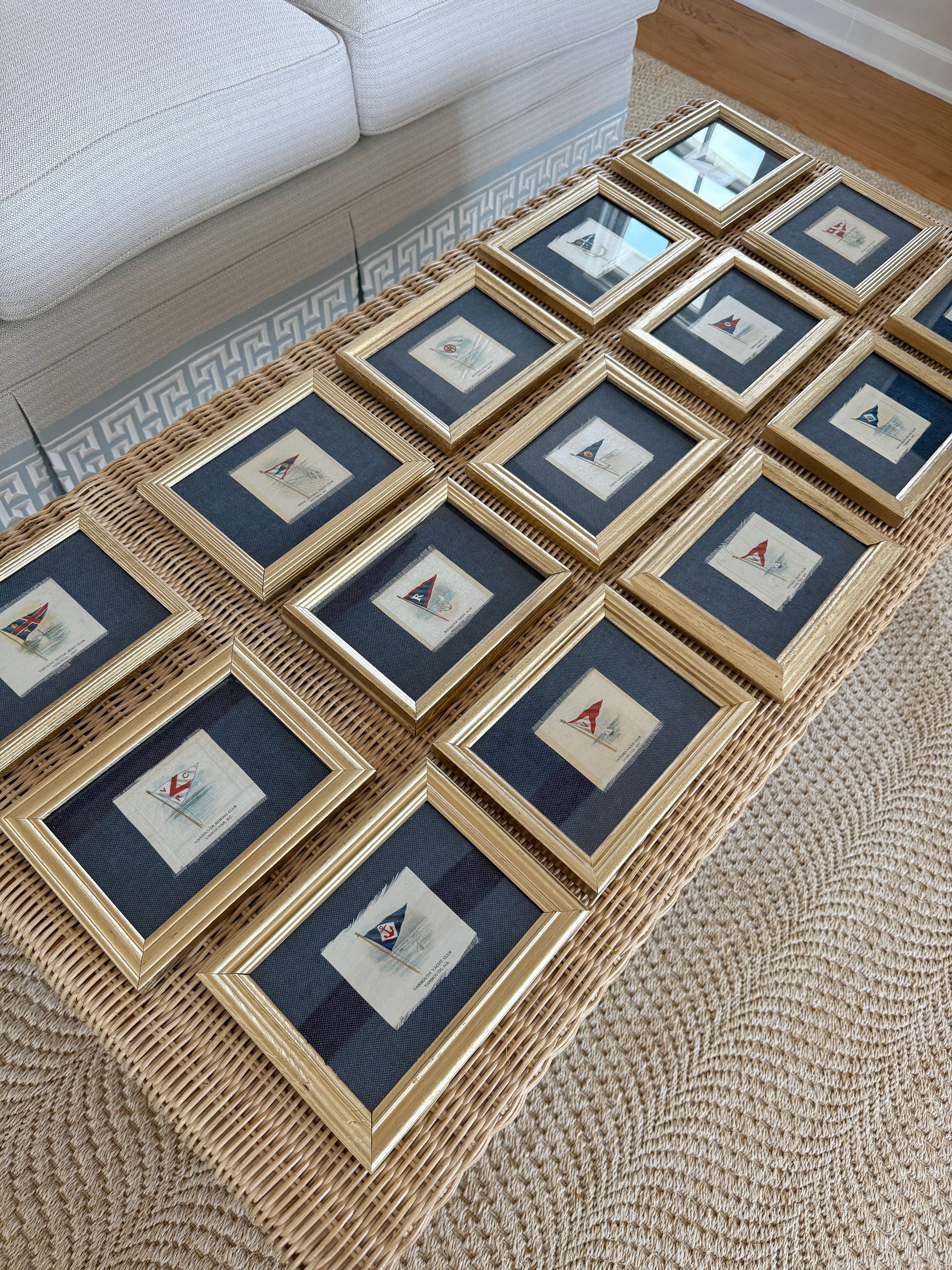 Set of four antique yacht and boating club silks mounted on navy blue linen fabric in gold frames. Each displays the club's burgee, name and club location. All measure approximately just over 6" x 8" in their vintage gold frames. All vary slightly. Coordinating silks shown in last photo are available in separate listings. The clubs included in this grouping are as follows: