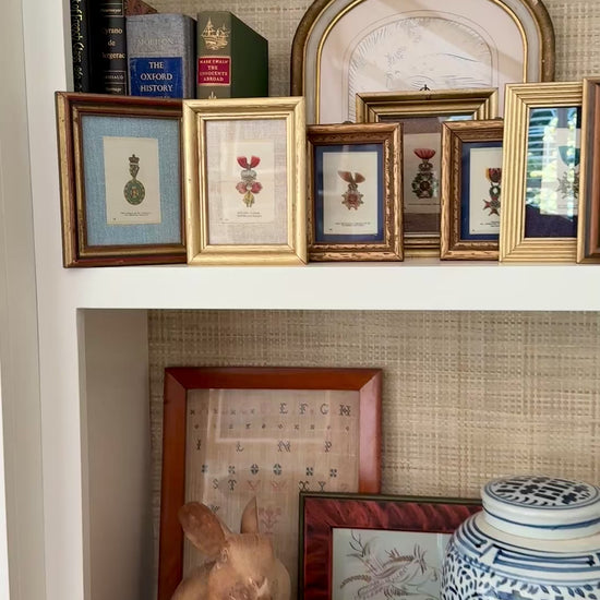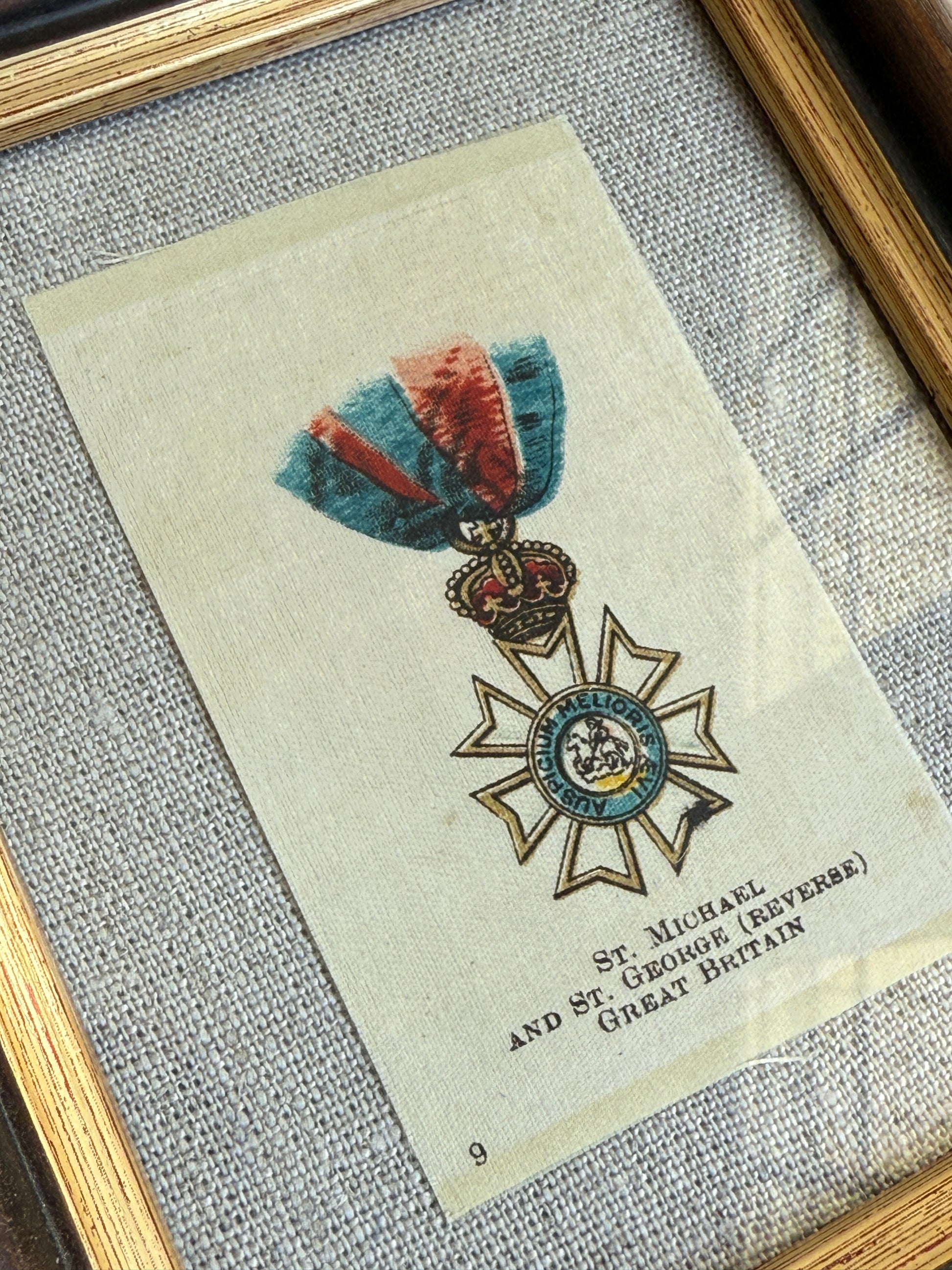 A collection of 7 antique tobacco silks each featuring a different pre - World War I military medal of honor mounted in vintage gilded frames. The largest in frame measures 6.5" x 5.5". Frames and silks in very good condition with light, age appropriate wear.