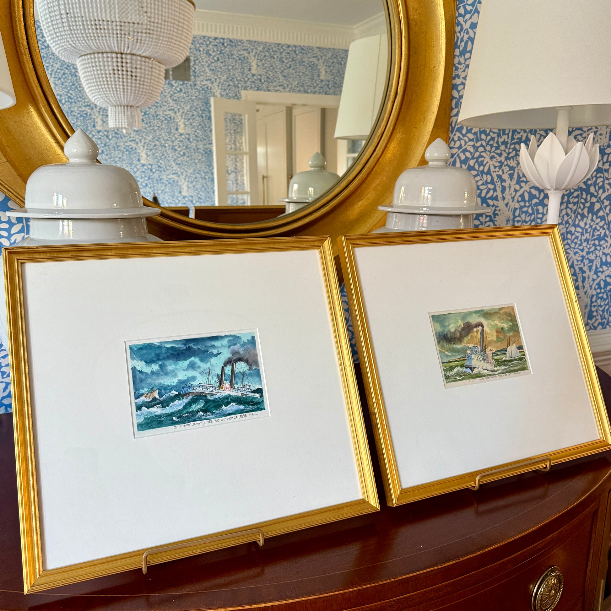 Set of Two Ray Prosser New England Steamship Portrait Watercolor Paintings in Gold Frames