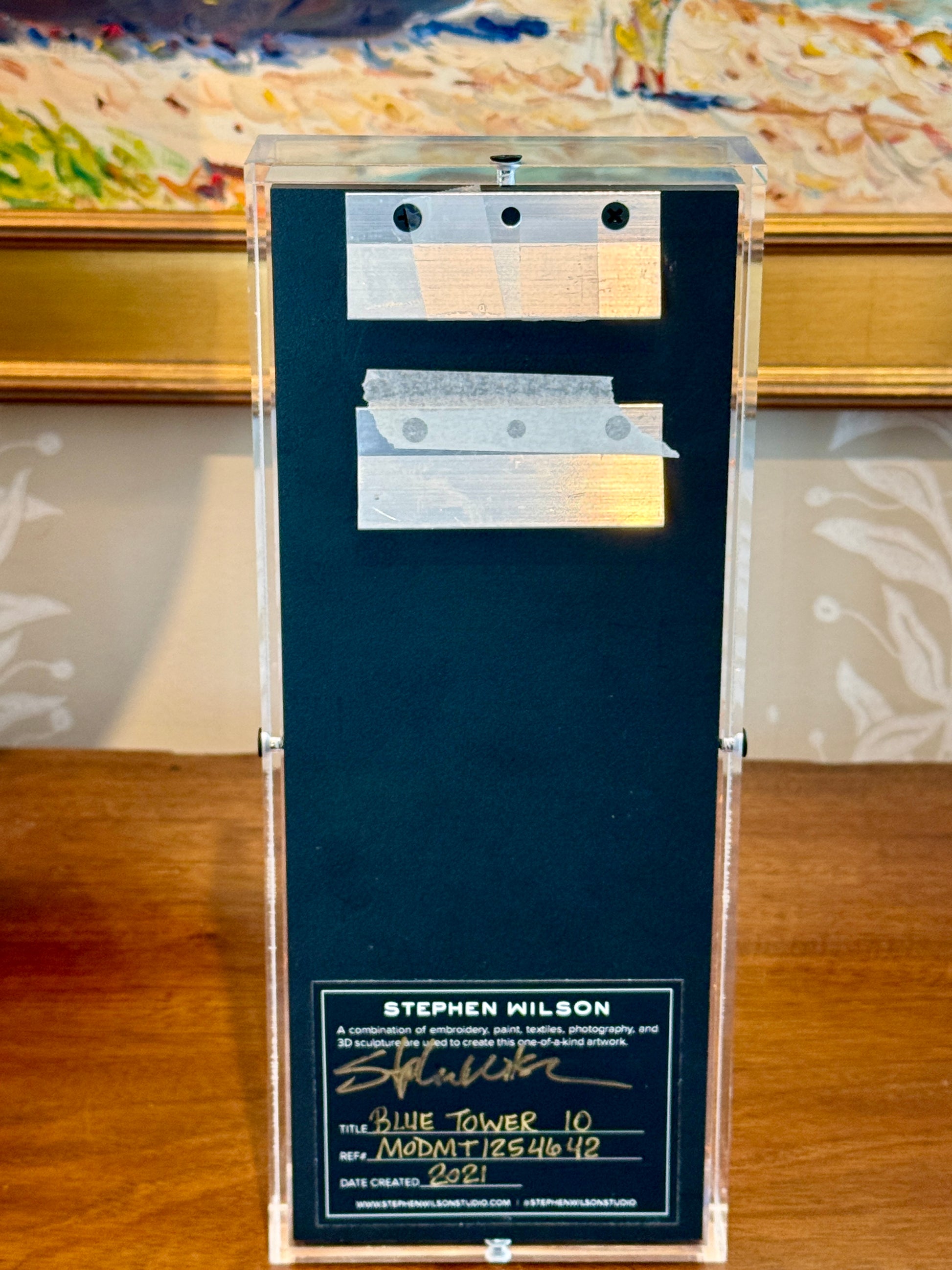 Stephen Wilson (American, 21st century) three dimensional embroidery and mixed media piece stitched onto a Hermes shopping bag. Signed and titled Blue Tower 10 on the reverse. Artwork in acrylic shadowbox measures 12" x 5". Hanging hardware included. Artwork and shadowbox in very good condition.