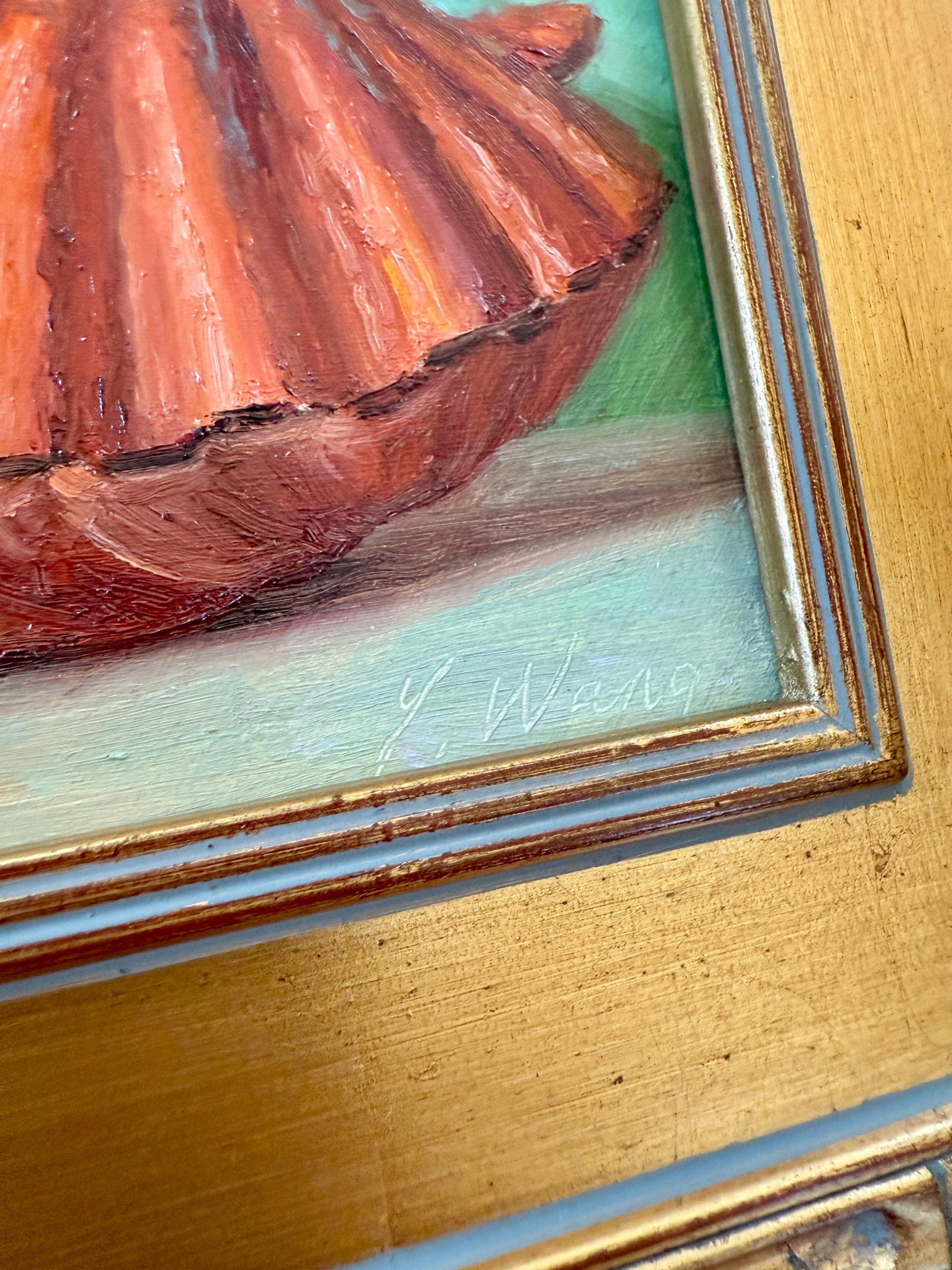 A contemporary, finely done oil painting on board realist still life of a starfish and closed scallop shell by Youqing Wang (American / Chinese, 21st century). Signed lower right. Artwork and gold solid wood frame with detailed corners measures 9.5" x 11.5". Artwork and frame in very good condition. Coordinating shell still life available in a separate listing.