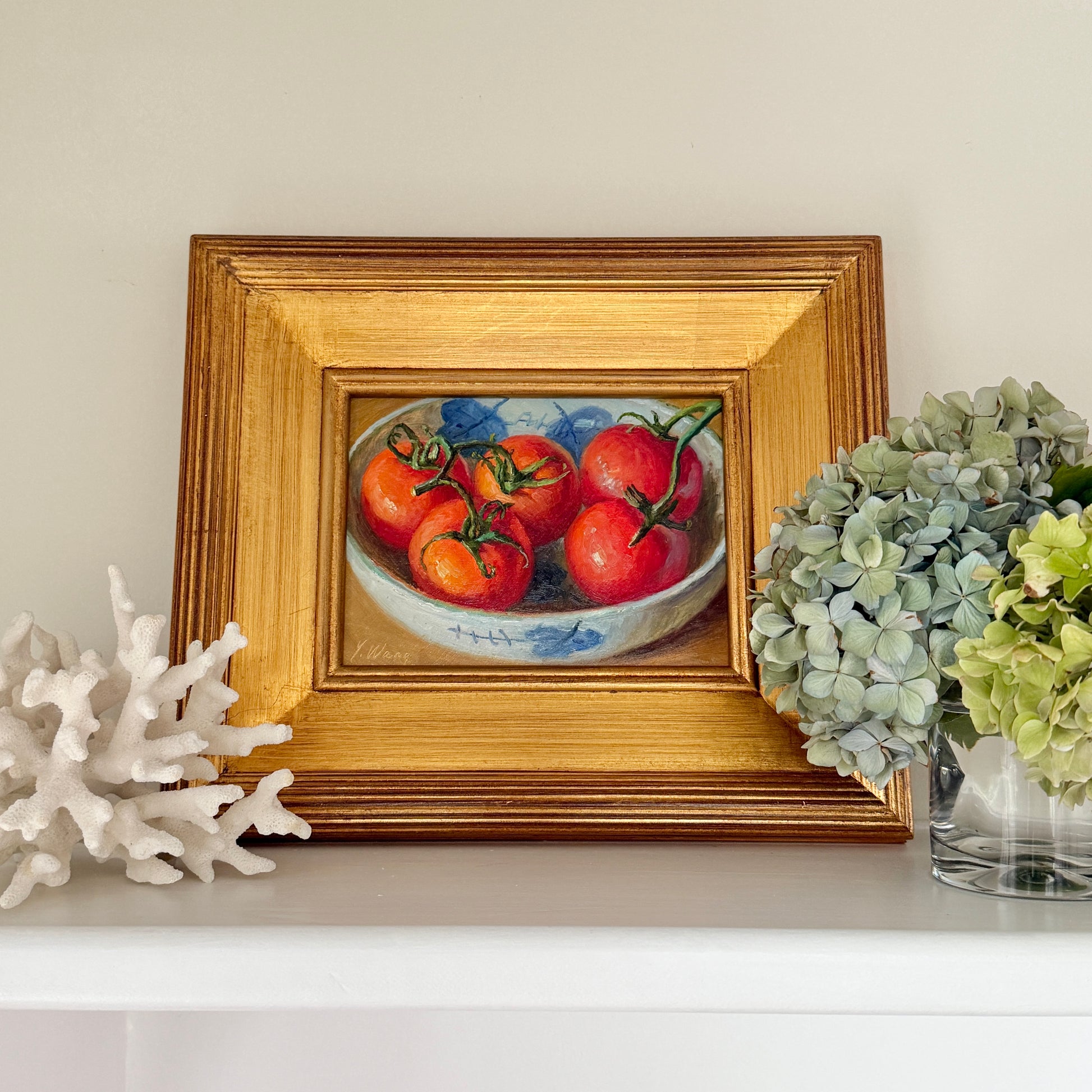 A contemporary, finely done oil painting on board realist still life of a grouping of summer tomatoes resting in a blue and white Chinoiserie style bowl by Youqing Wang (American / Chinese, 21st century). Signed lower right. Artwork and gold solid wood frame with detailed corners measures 11.75" x 13.5". Artwork and frame in very good condition.