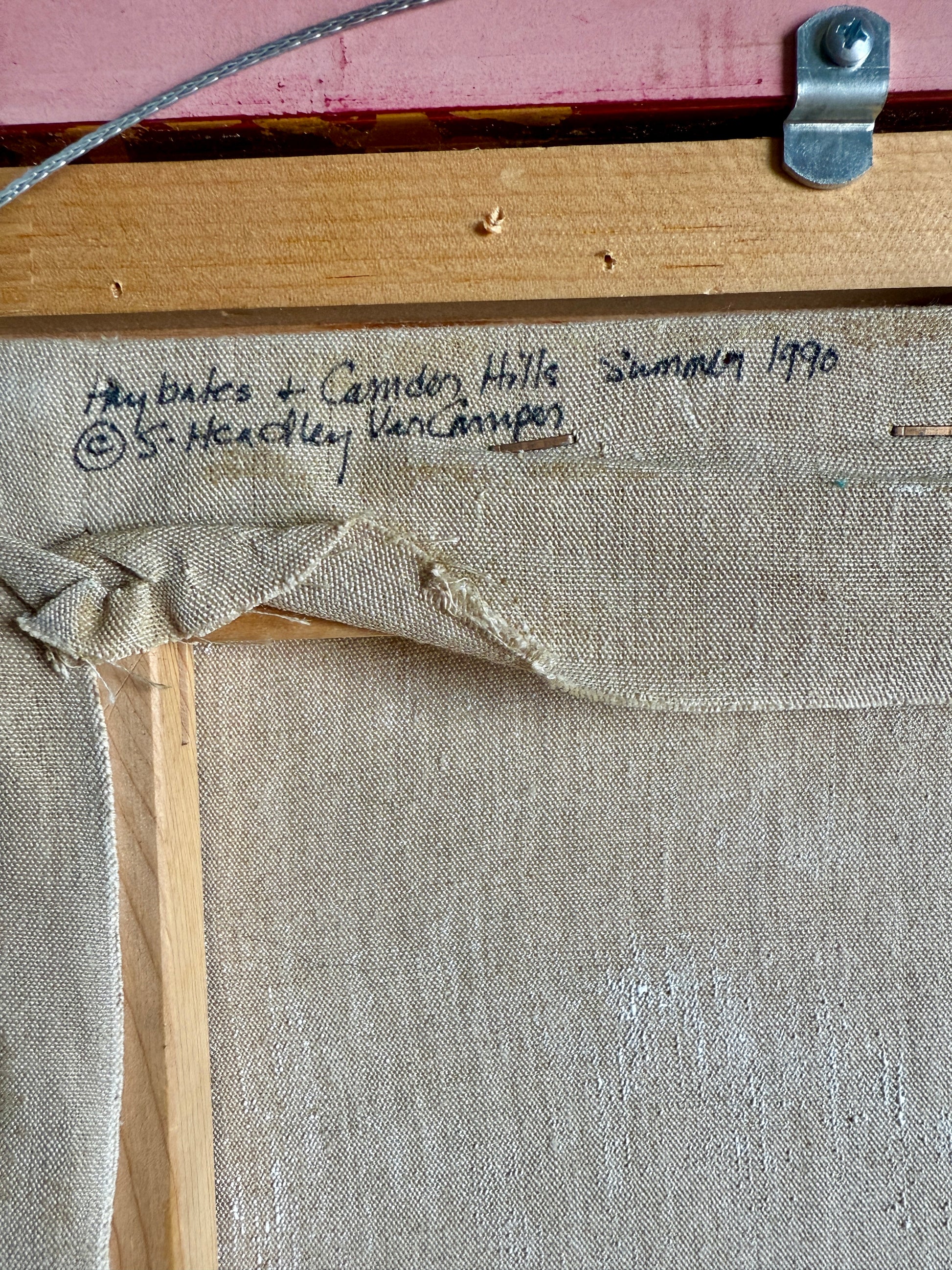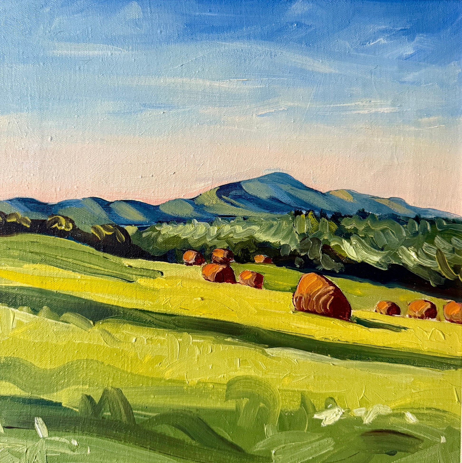 Susan Van Campen (American / Maine, b. 1951) rolling green landscape oil painting on linen titled Hay Bales and Camden Hills. Signed "S. Headley Van Campen" on reverse. Artwork in custom gold frame with linen liner measures 18" x 18". Artwork in very good condition. Frame in good condition with scattered scratches to gold finish. Coordinating Van Campen piece is available in a separate listing.