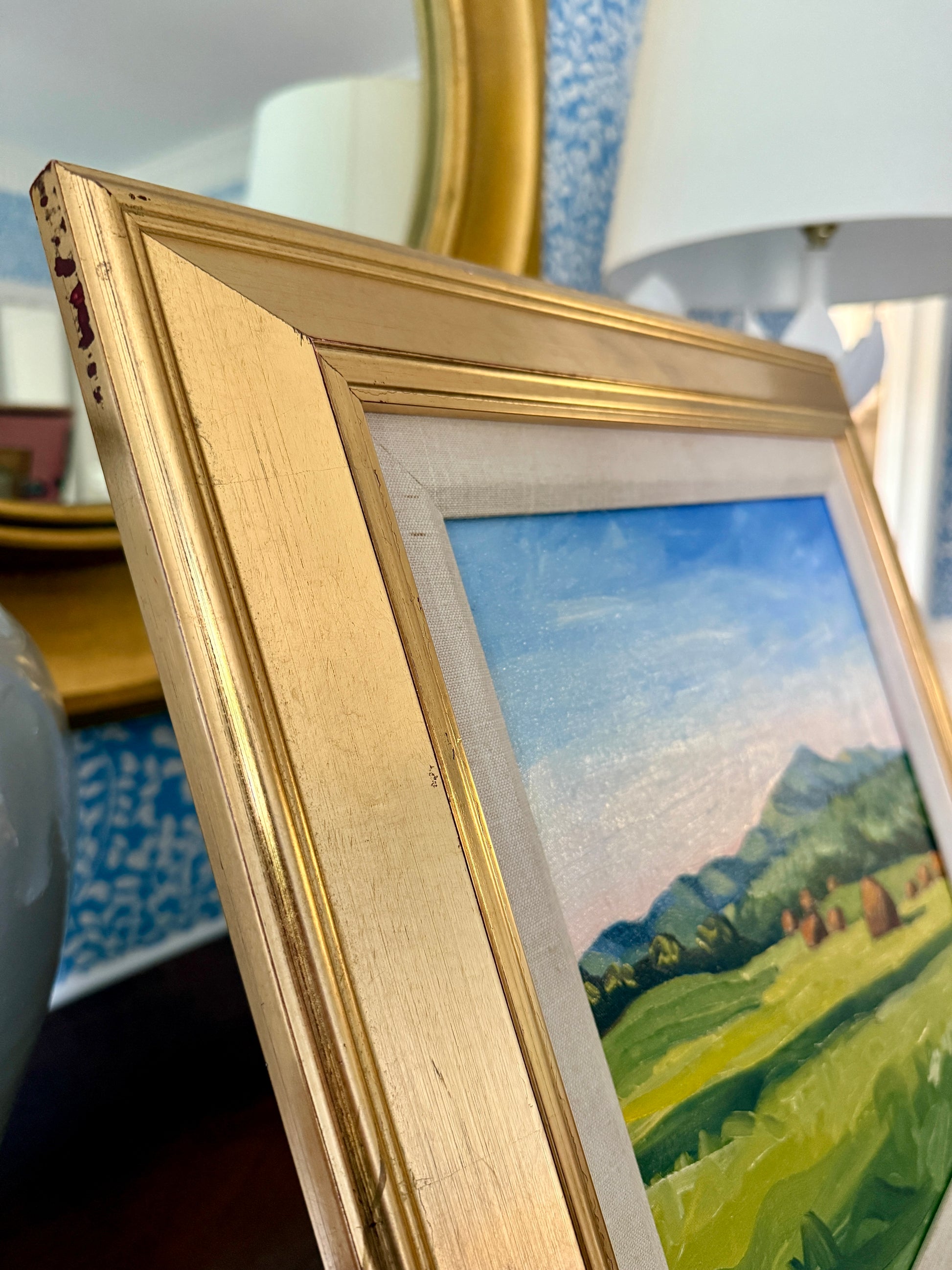 Susan Van Campen Hay Bales and Camden Hills Maine Landscape Oil Painting in Gold Frame