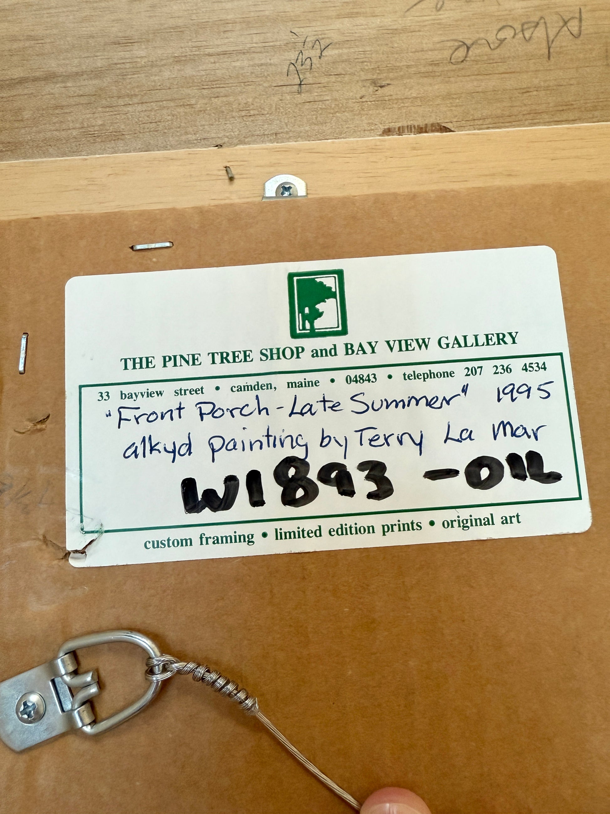 An oil painting on panel finely done and highly detailed summer cottage portrait by Terry LaMar (American / Maine, 20th century). Titled Front Porch - Late Summer, Maine on the reverse. Label from Bayview Gallery of Camden and Portland, ME on the reverse. Artwork in custom gold wood frame with linen liner measures 26" x 22". Artwork in excellent condition. Frame in very good condition with light wear.