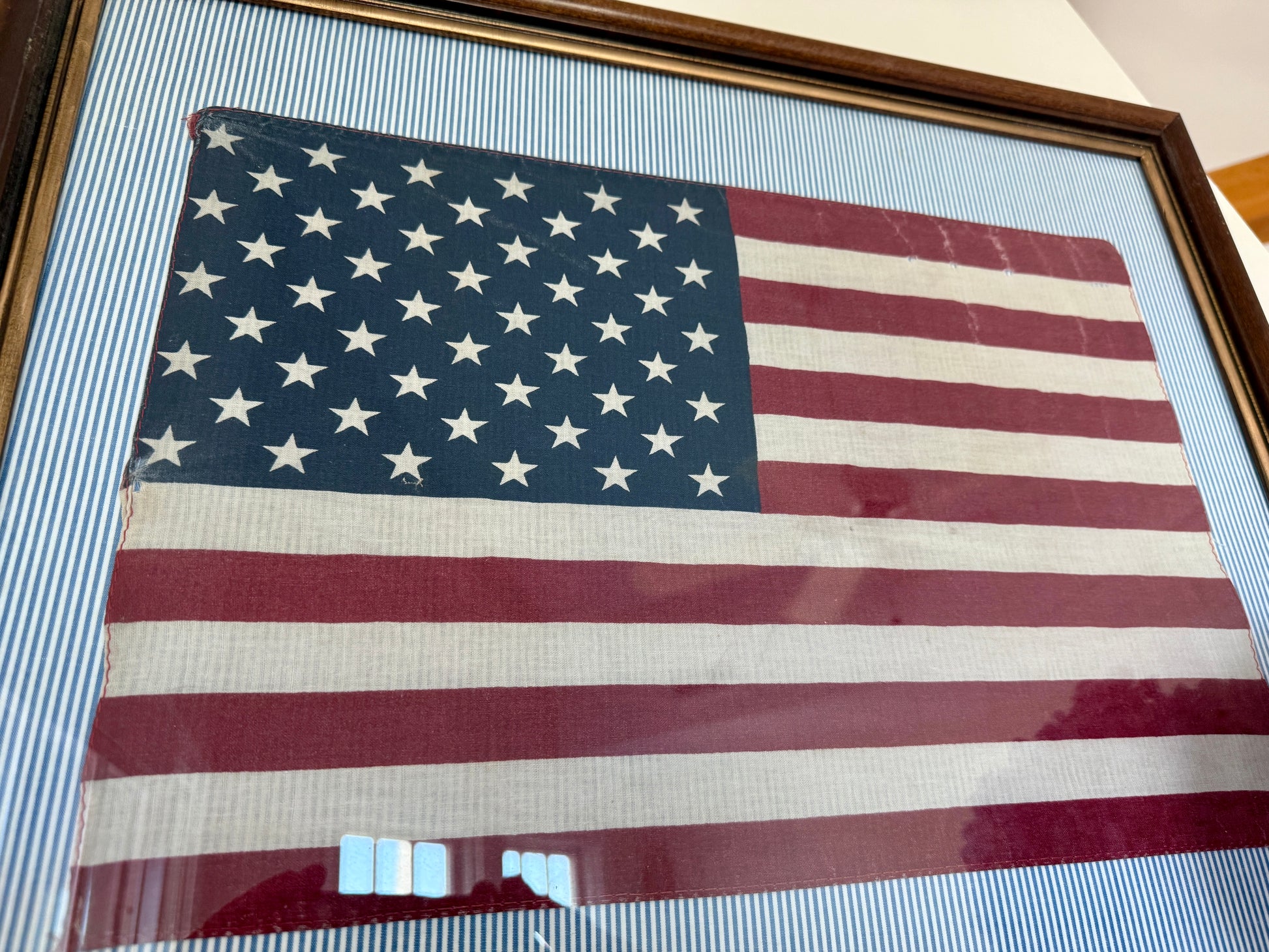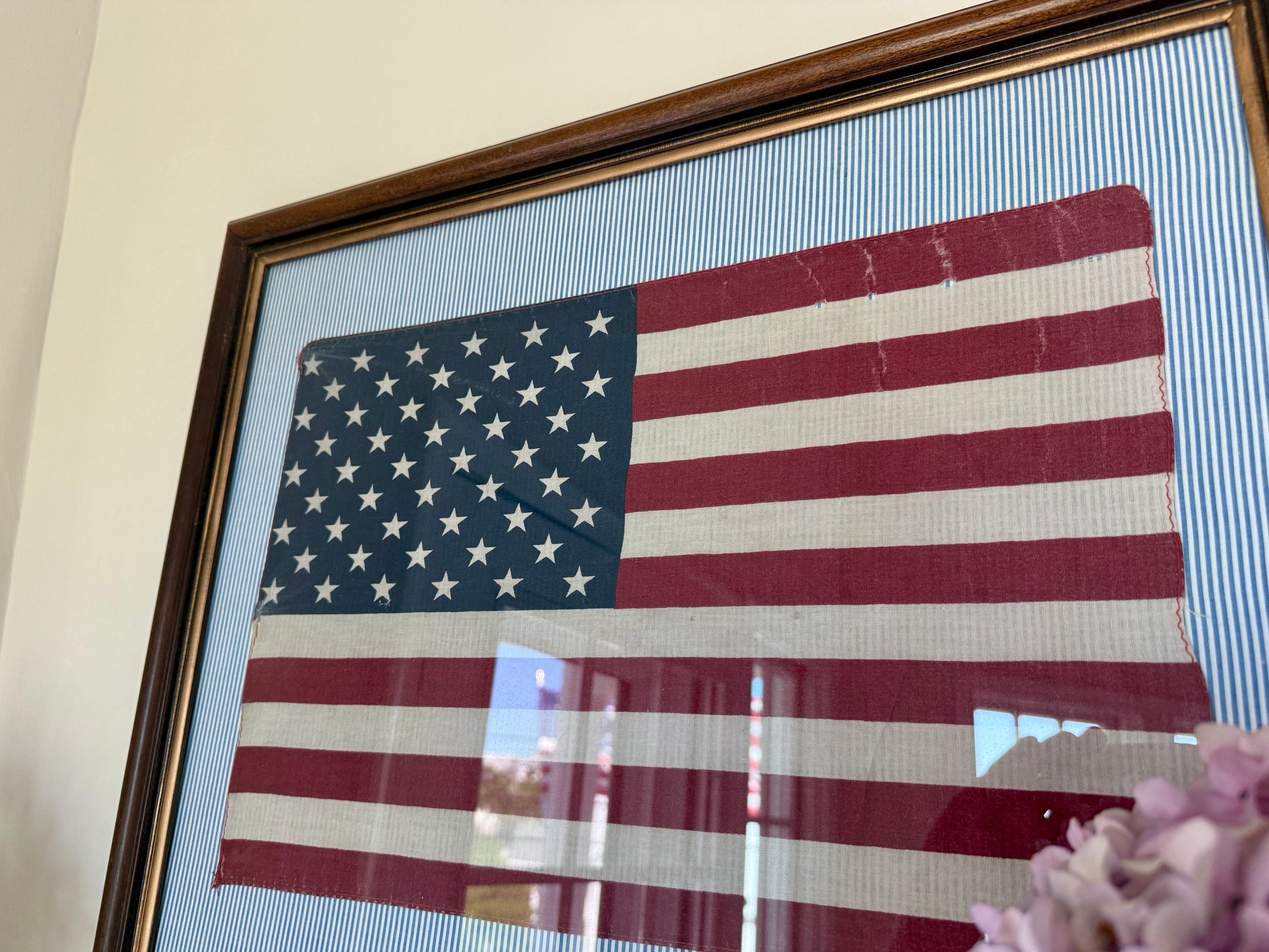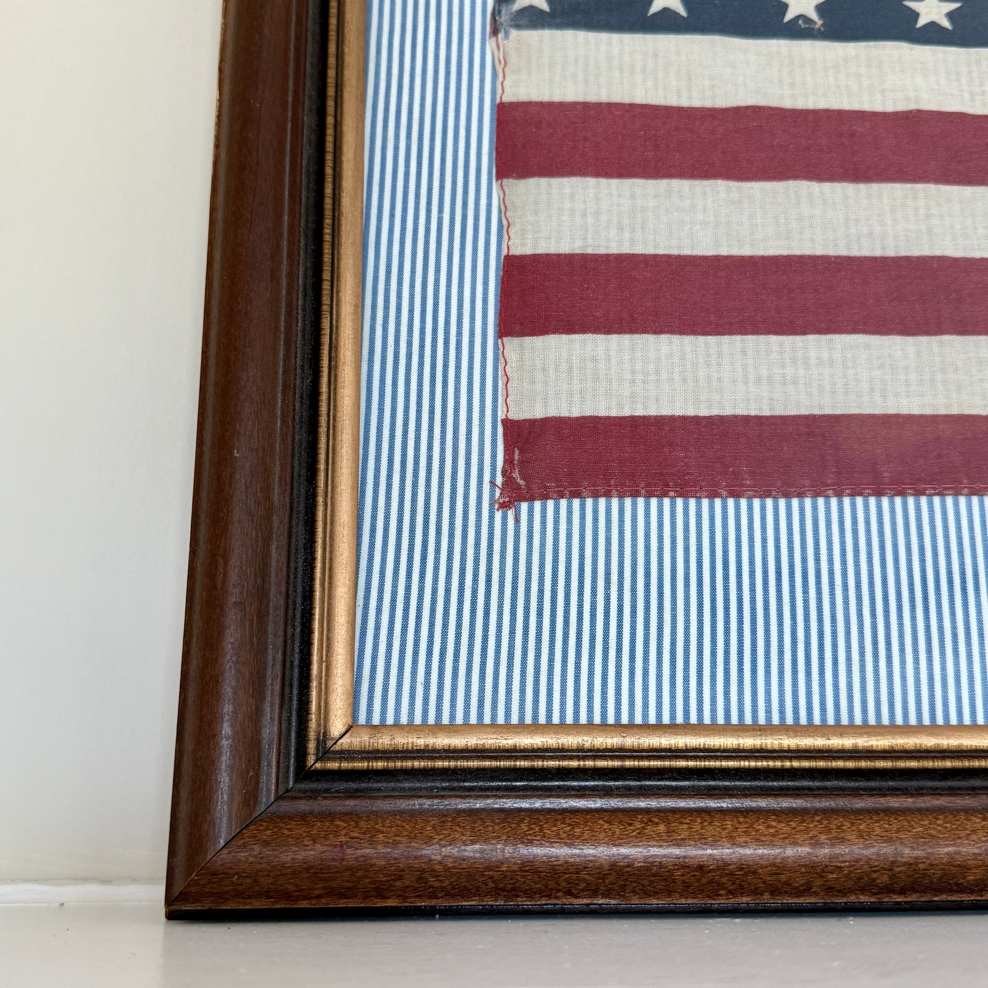 Vintage 50 staggered star American flag mounted on blue and white ticking stripe fabric. Flag in vintage wood frame with gilt inner measures 18.5" x 22.5", and is under glass. Flag has great patina. Frame in very good, vintage condition with light wear.