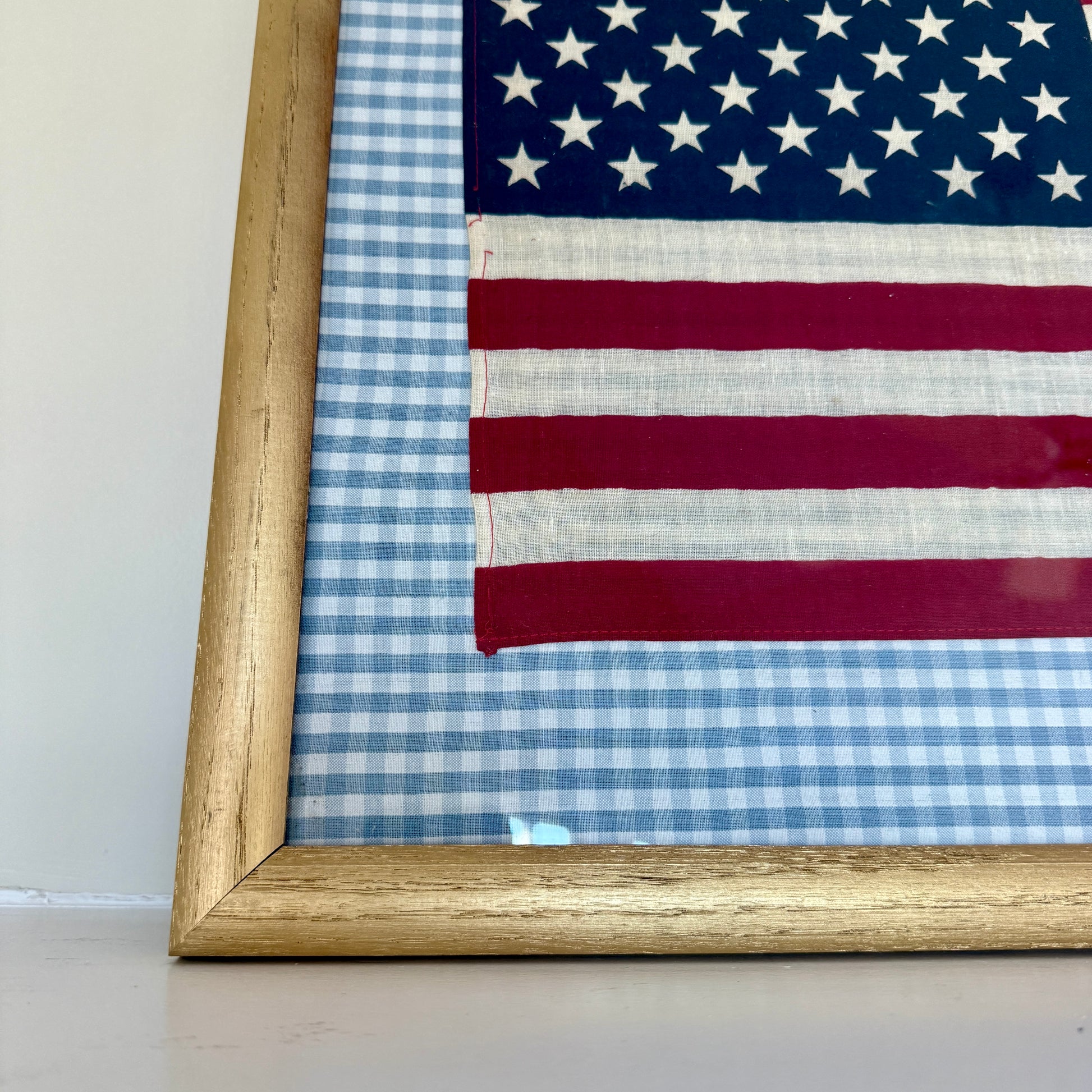 Vintage 50 staggered star American flag mounted on light blue and white gingham fabric. Flag in vintage gold wood frame measures 17.75" x 21.5", and is under glass. Flag has light patina. Frame in very good, vintage condition with light wear.