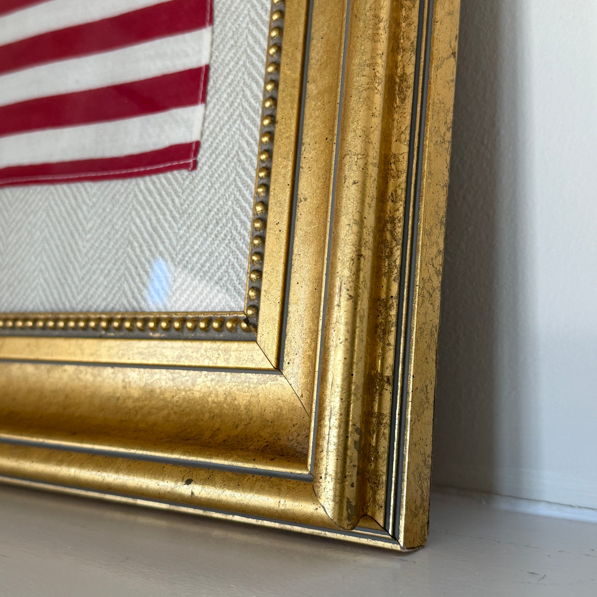 Vintage 50 staggered star American flag mounted on a neutral tan and ivory herringbone fabric. Flag in vintage gold wood scoop beaded frame measures 16.5" x 18.5", and is under glass. Flag has light patina. Frame in very good, vintage condition with light wear.