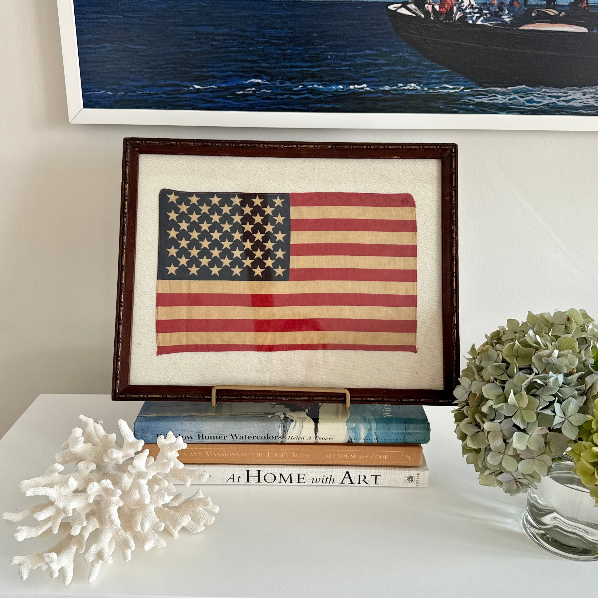 Vintage 50 staggered star American flag mounted on an ivory duck cloth fabric. Flag in an early 20th century antique wood frame measures 11" x 14". Under glass. Flag has great patina. Frame in very good, antique condition with light wear.