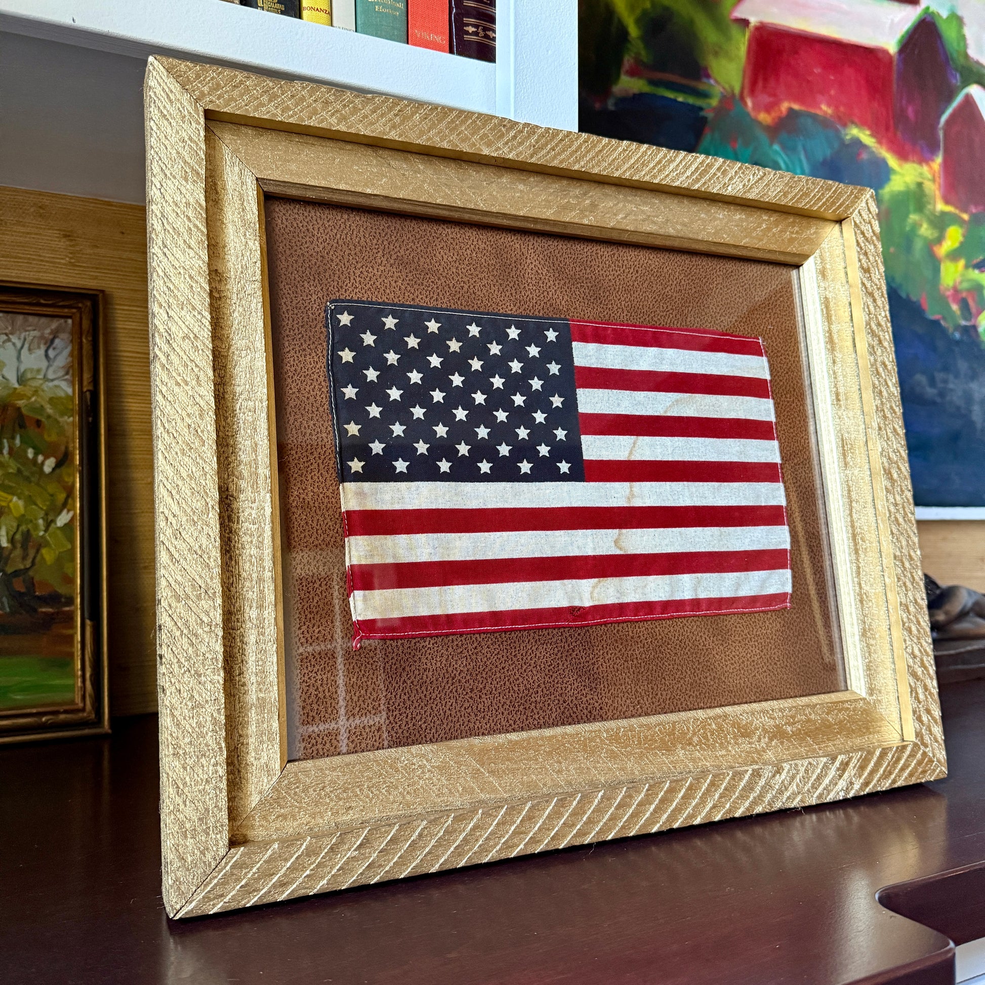 Vintage 50 staggered star American flag mounted on faux leather. Flag in thick, gilded finish barnwood frame measures 14.75" x 17.75", and is under glass. Flag has great patina. Frame in very good, vintage condition with light wear.