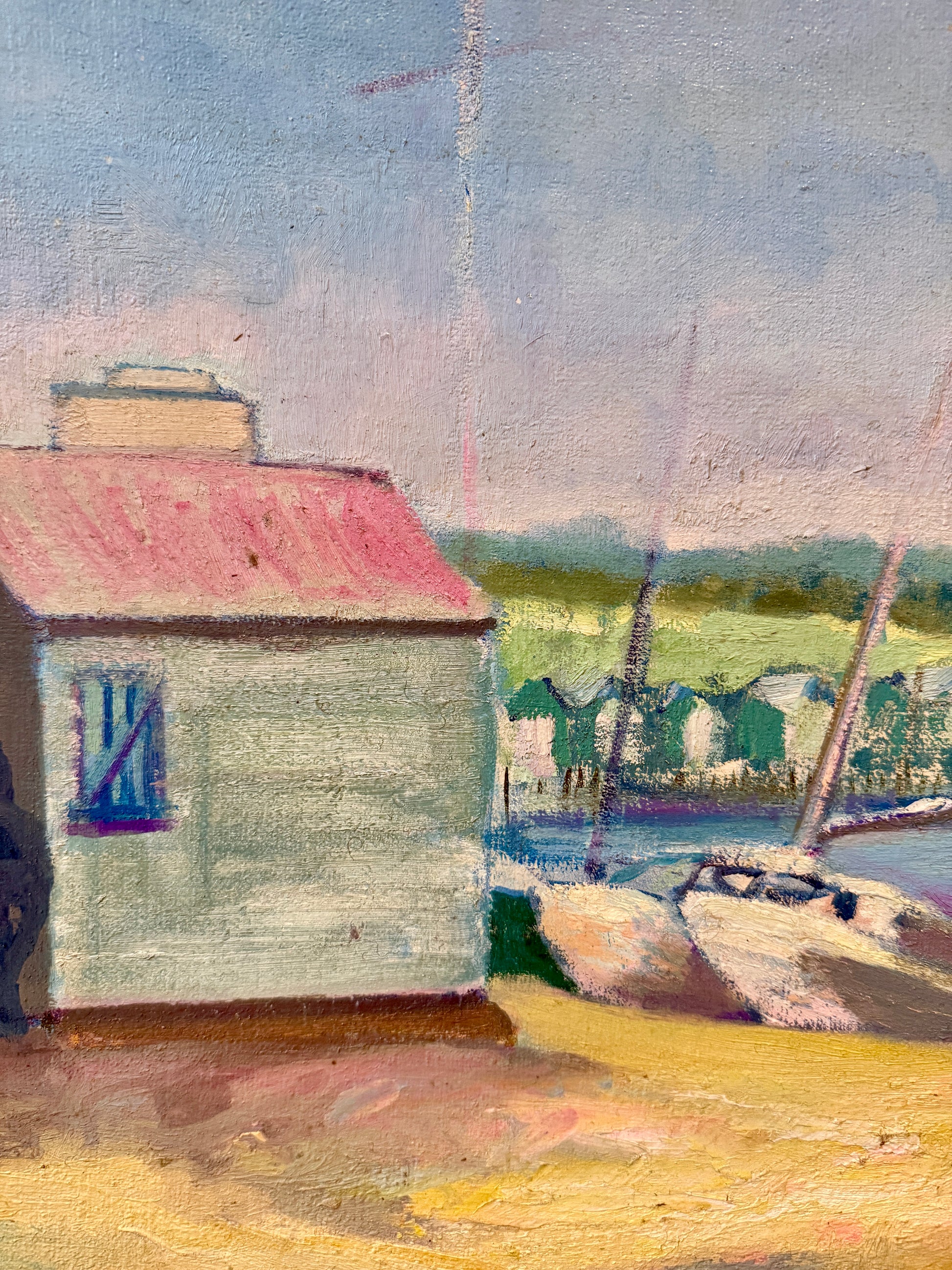 A vintage oil painting on board of a pastel-hued harbor scapes. A pink-roofed boathouse on the left, and sailboats bobbing in the harbor at right. Artwork in thick, contemporary gold wood frame measures 27.25" x 31.25". Artwork in good, vintage condition with age appropriate wear. Frame in very good condition.