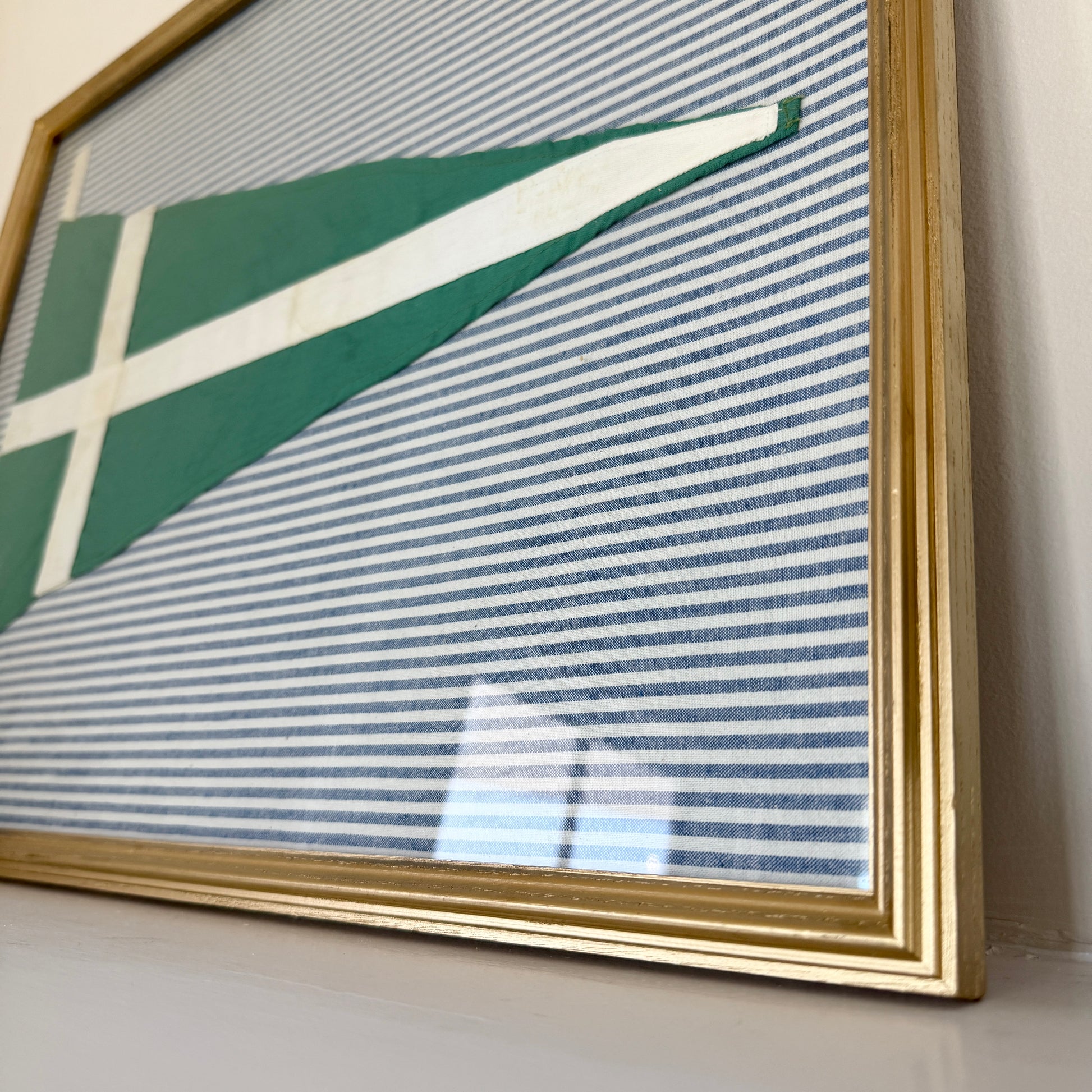 Vintage Homemade Green and White Nautical Burgee on Blue Ticking Stripes in Gold Frame