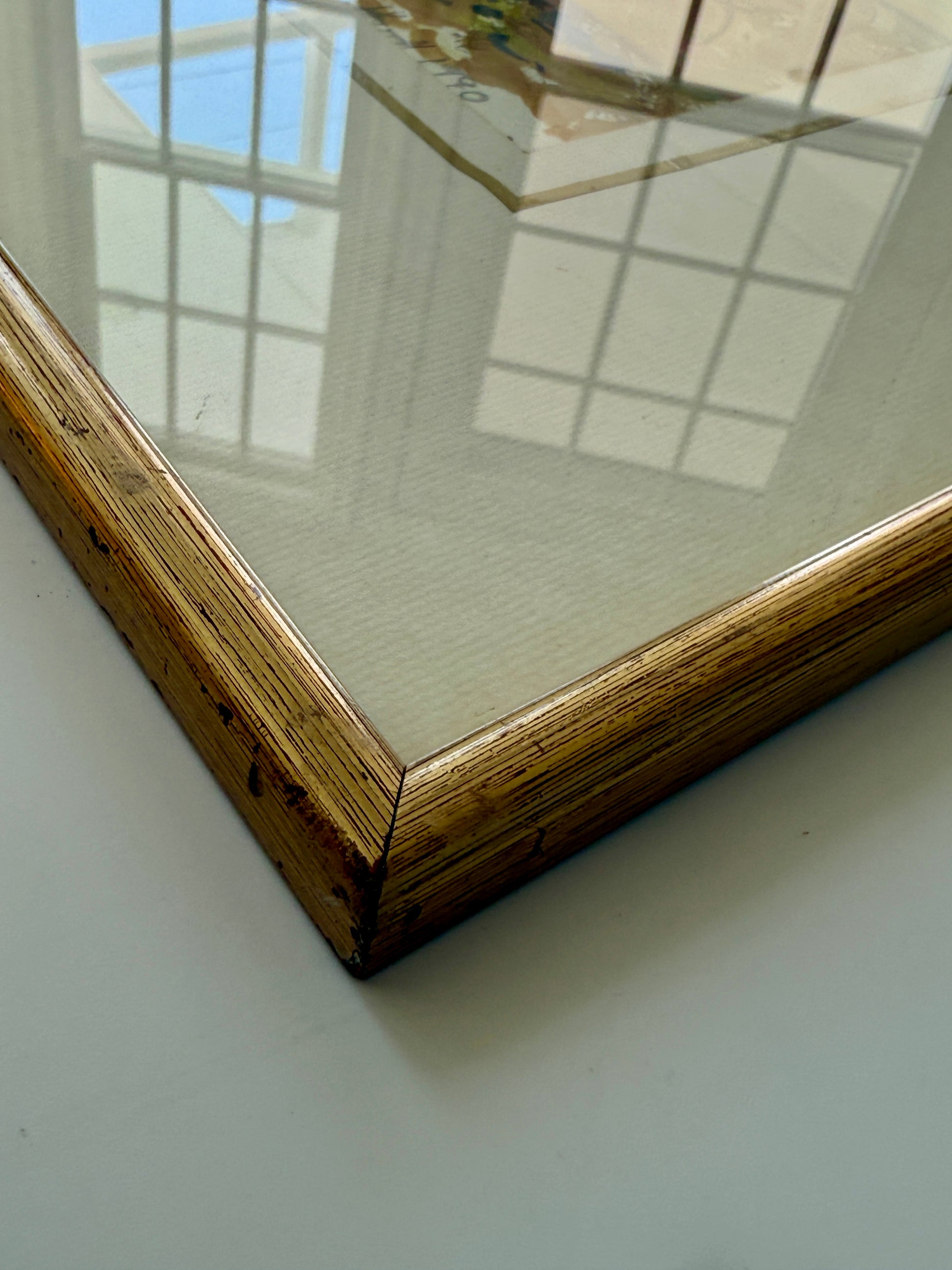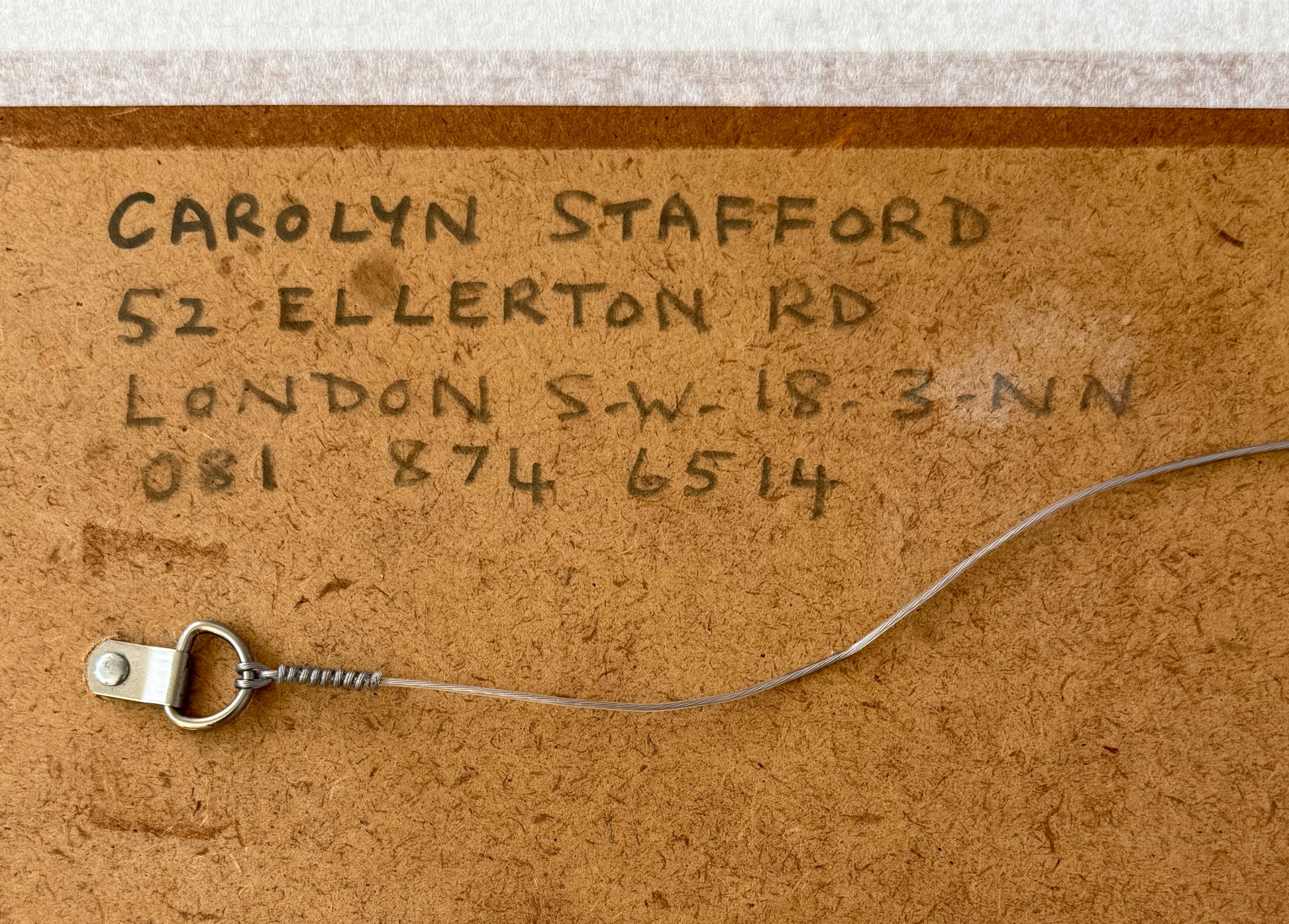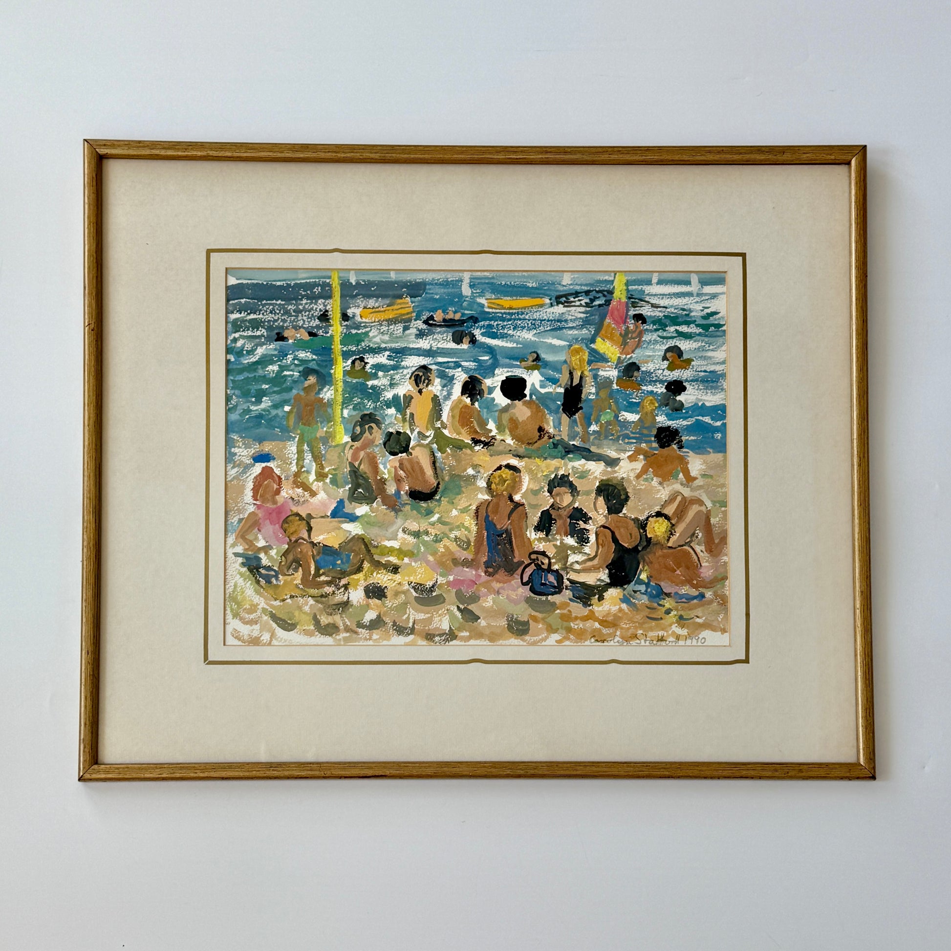 A vintage 1990 acrylic painting by Carolyn Stafford (British, 20th century) of a colorful shoreside scene titled Crowded Beach. Signed and dated at lower right. Artwork in gold wood frame measures 18.75" x 22.75". Artwork in very good condition. Frame and matting in good vintage condition with light allover wear.