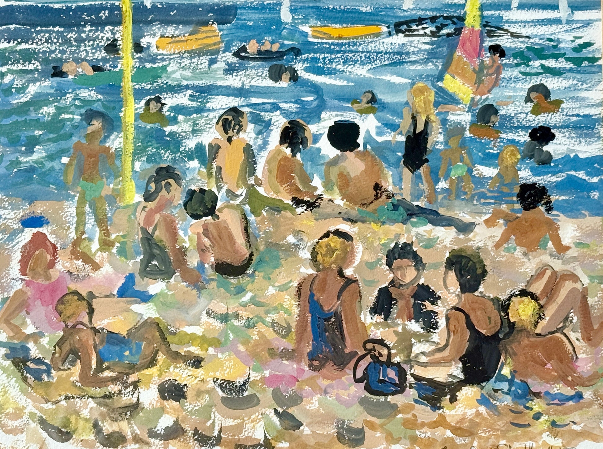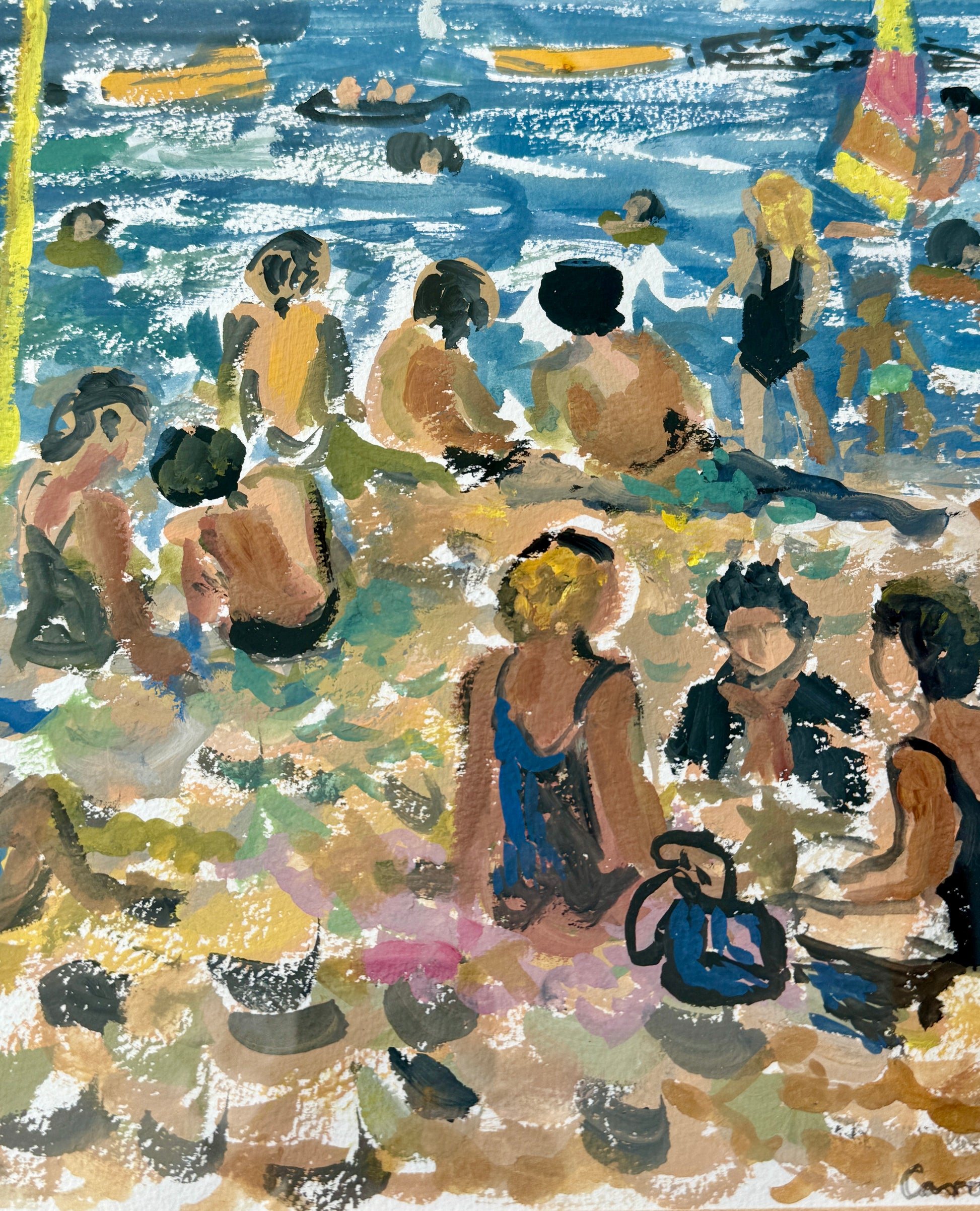 Vintage Carolyn Stafford Crowded Beach Seascape Painting in Gold Frame