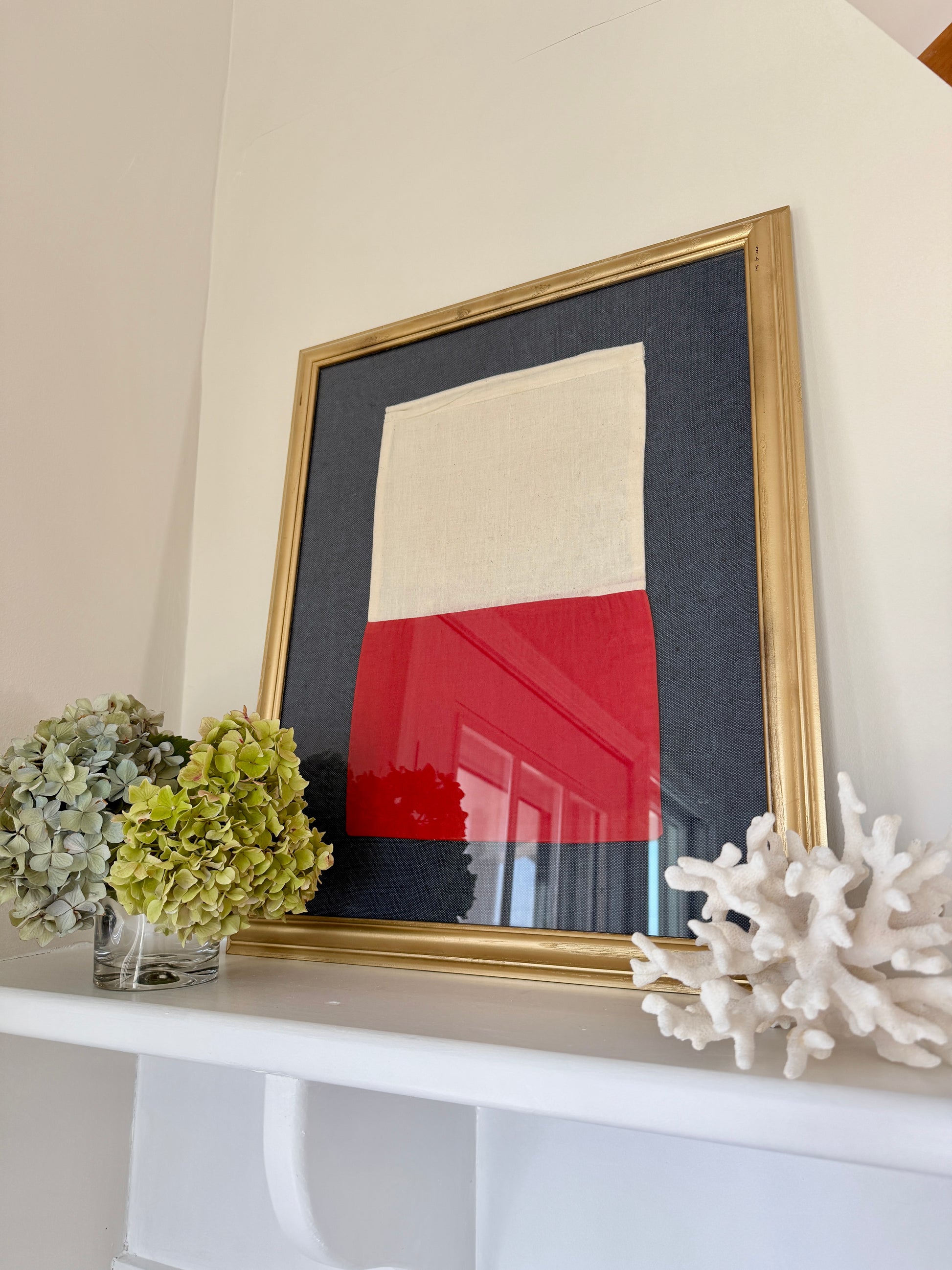Vintage Cotton Canvas Nautical Yachting Signal Flag for "H" on Navy Pique in Gold Frame