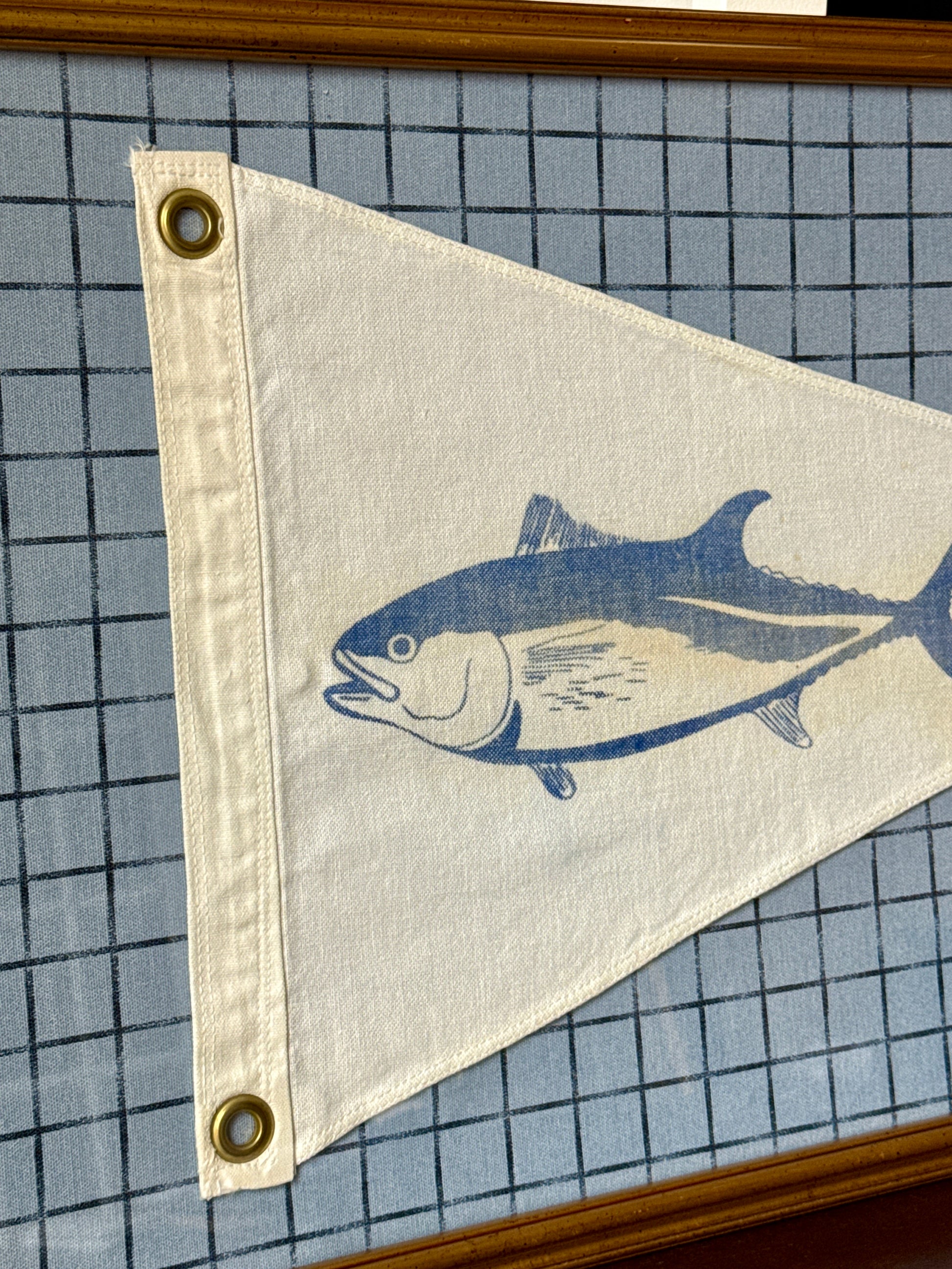 Vintage Cotton Canvas Tuna Nautical Boating Flag on Blue Windowpane in Gold Frame