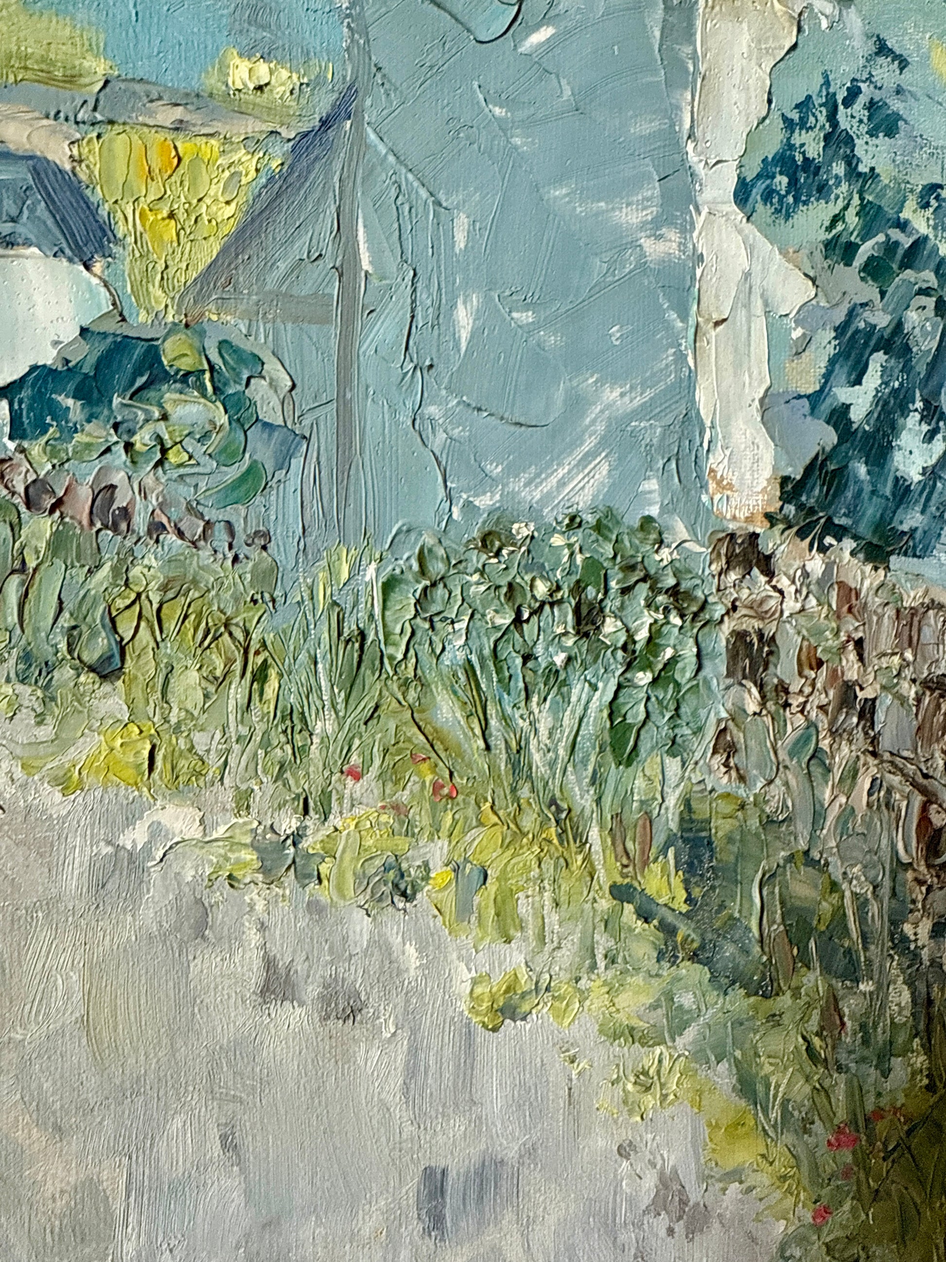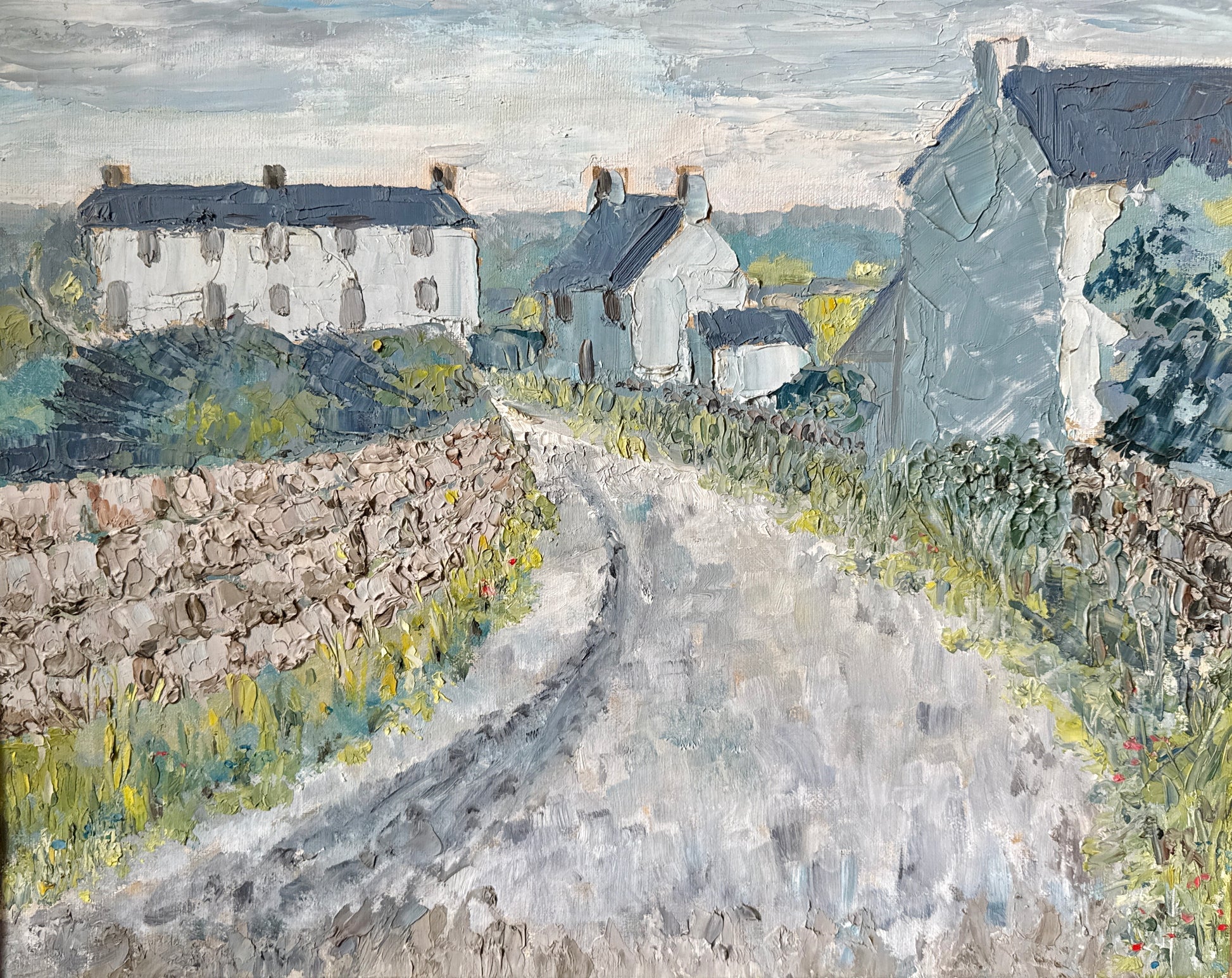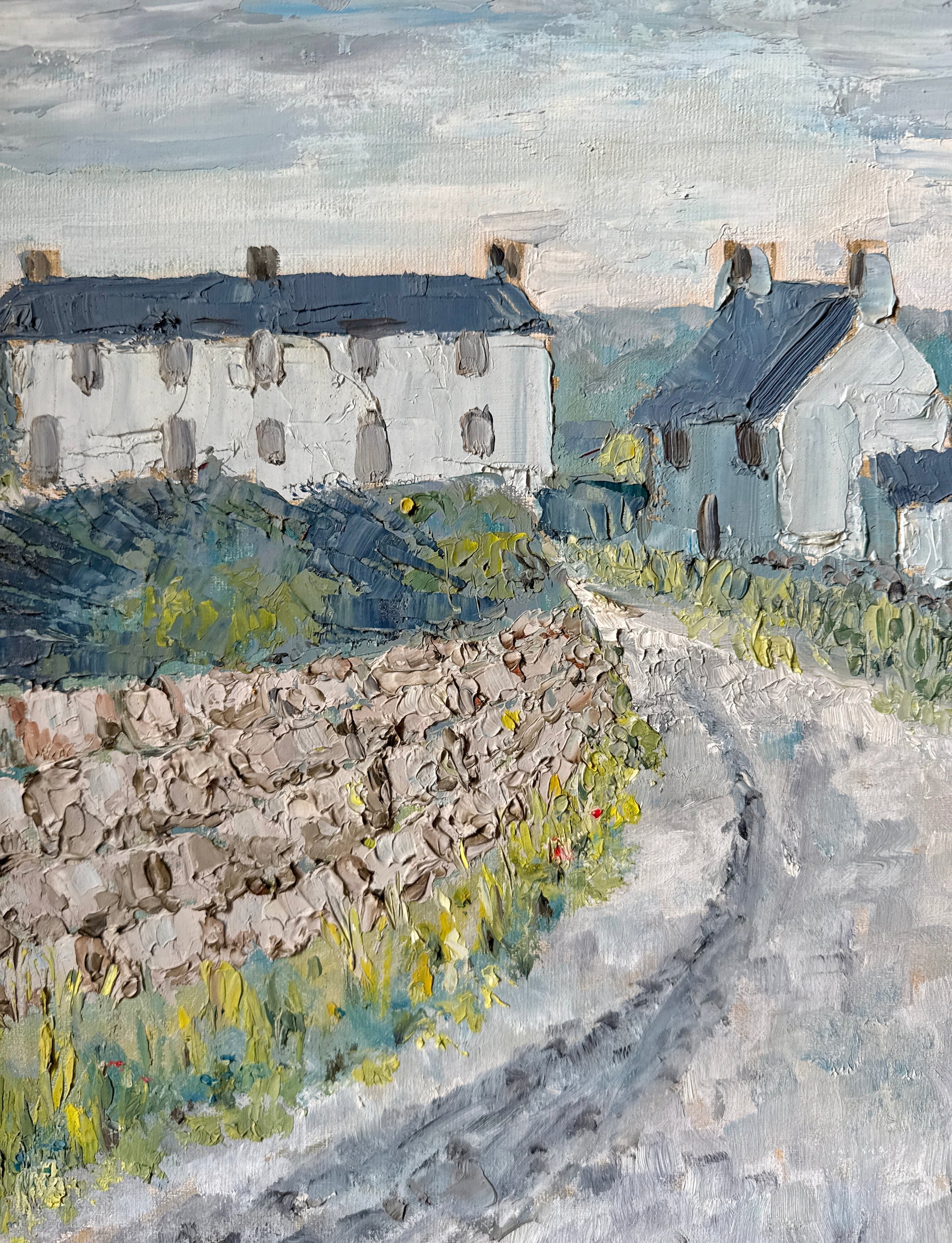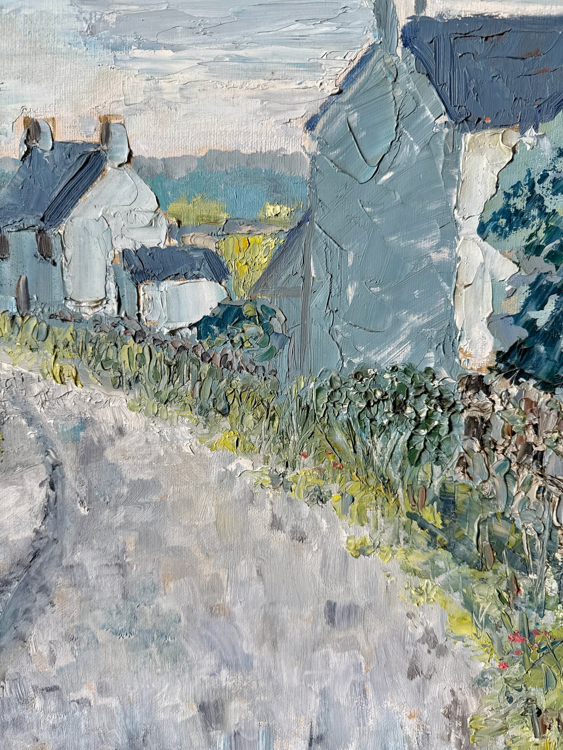 A charming, and heavily textured vintage oil painting on board of a country road winding along a stone wall and white country houses. Artwork in gold wood frame with Celtic corner details measures 19.5" x 23.5". Artwork and frame in very good condition.