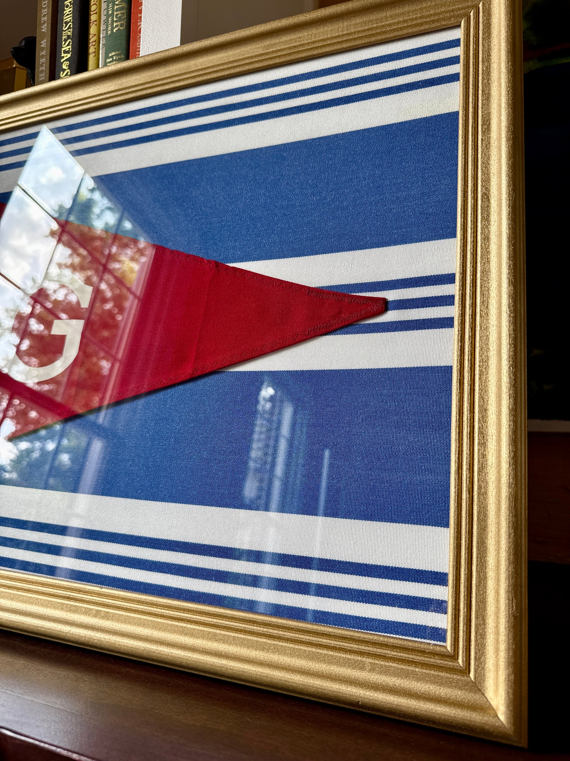 Vintage "G" Initial Canvas Burgee Nautical Flag on Blue White Stars in Gold Frame