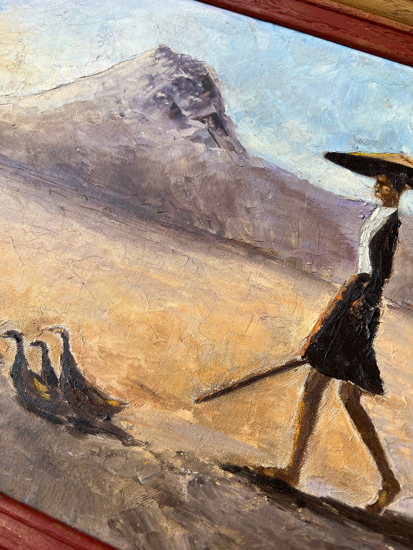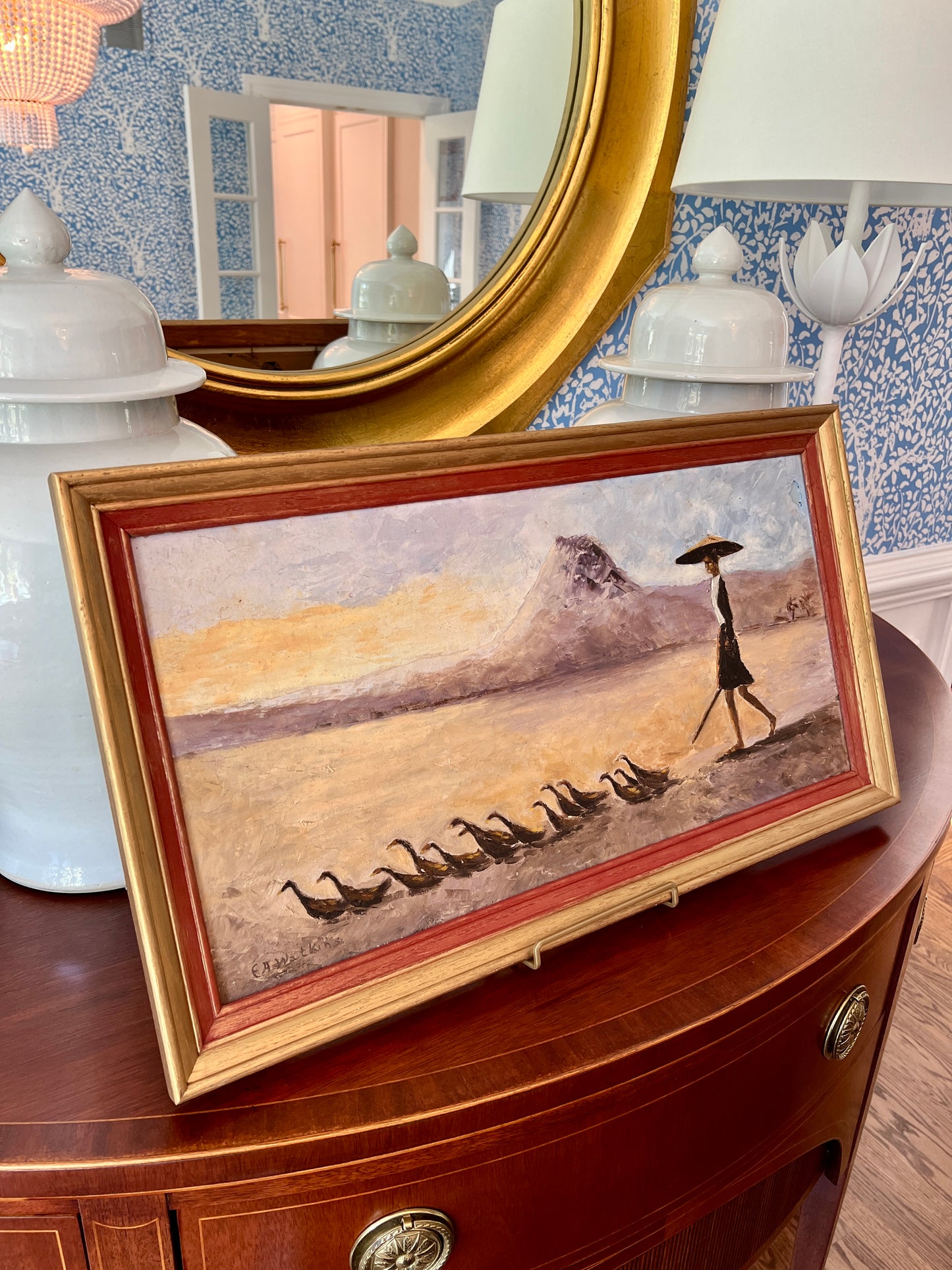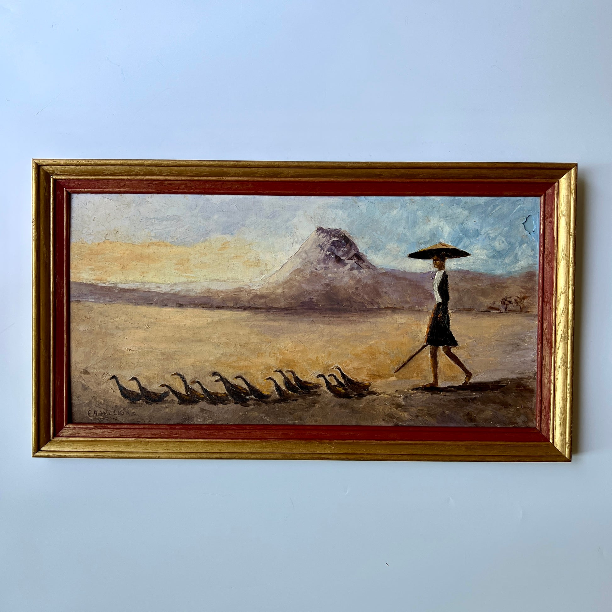 A vintage oil on board painting of a girl in a mountainous desert landscape leading an obedient lineup of ducks from behind. Signed lower right. Artwork in frame measures 14.75" x 26.75". Frame in good, vintage condition with minor wear. Painting in good, vintage condition with one touched up puncture in the top right corner as shown in photos.