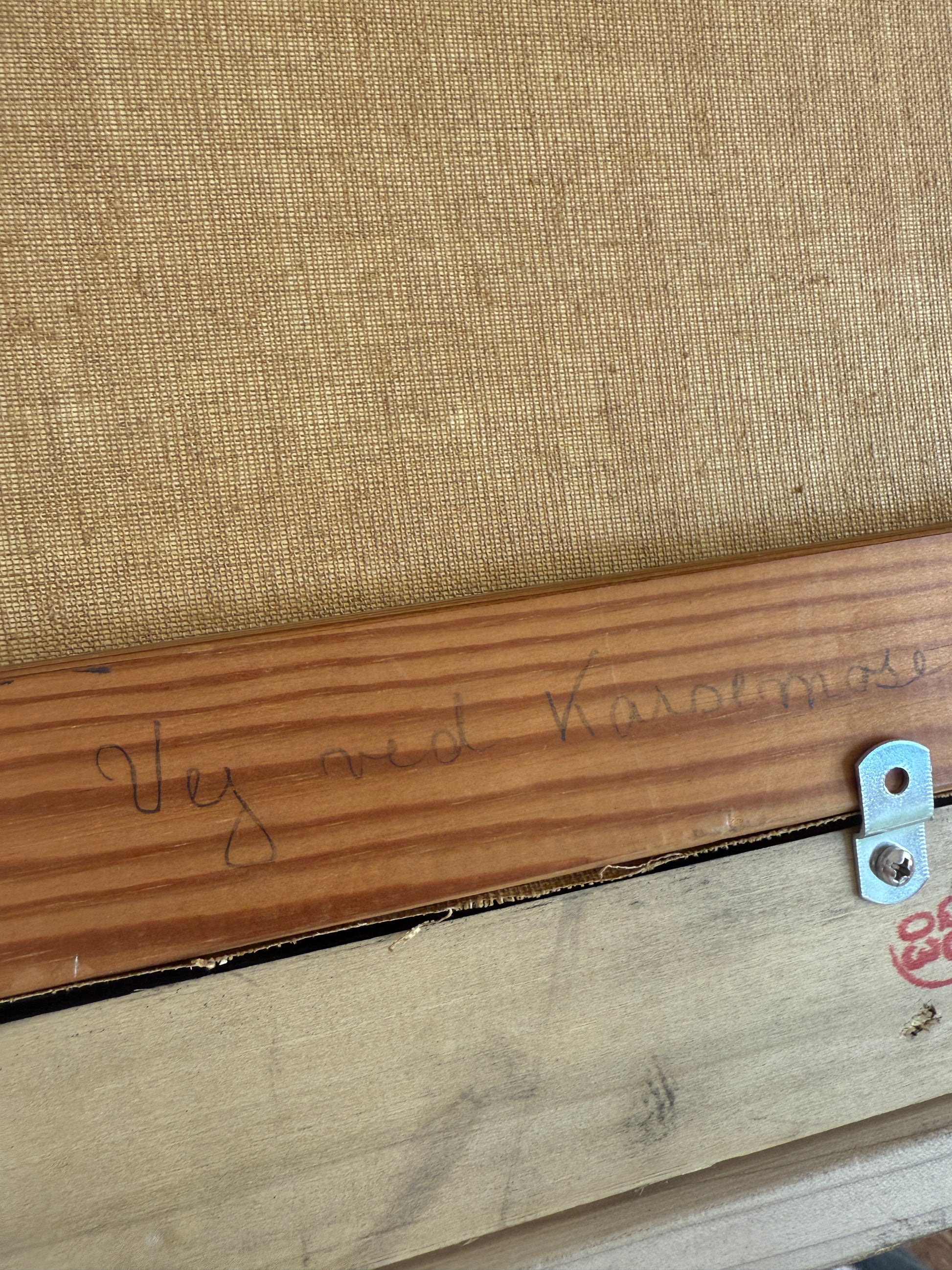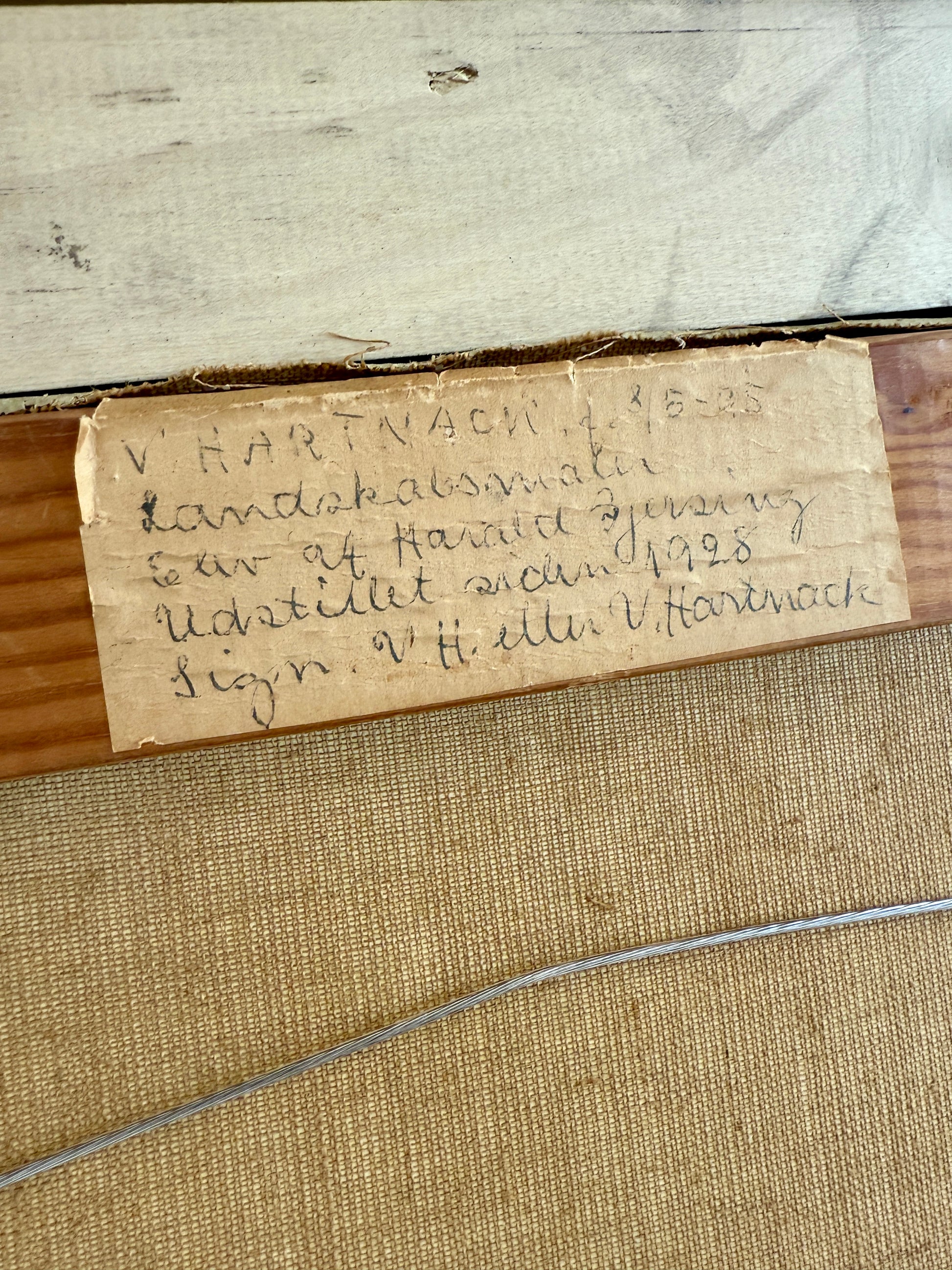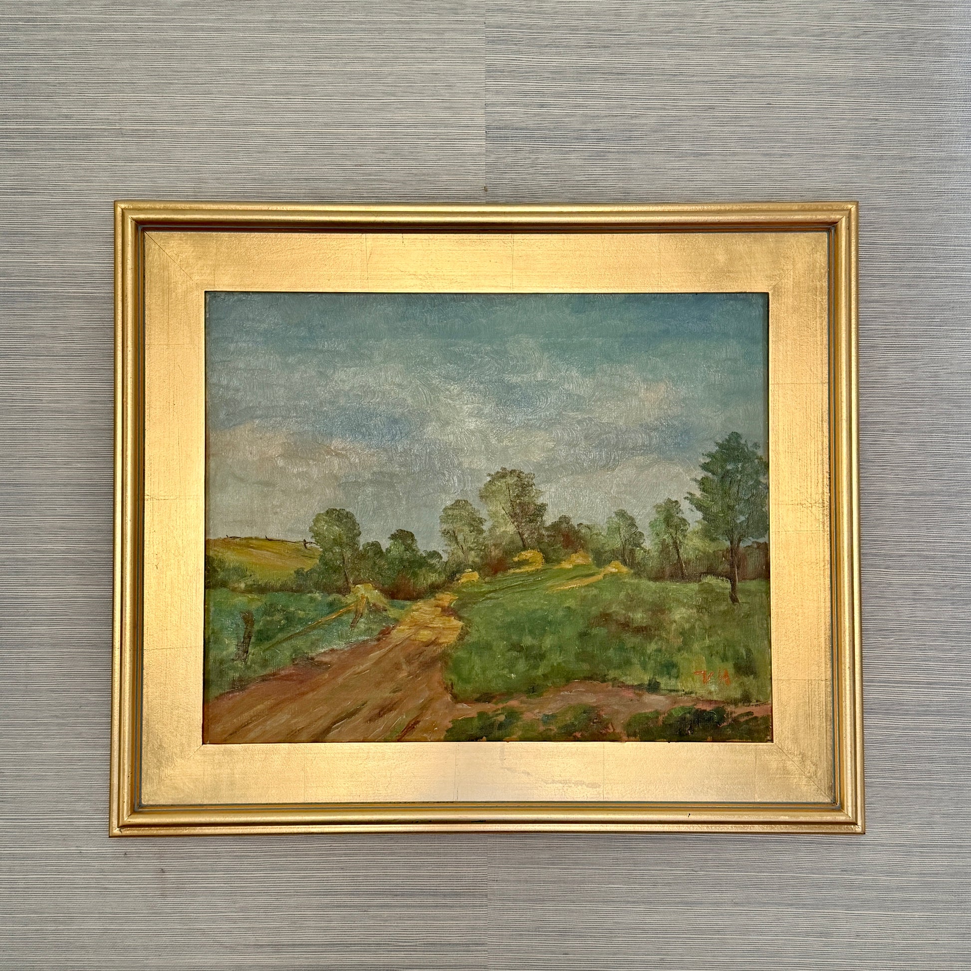A vintage impressionist oil painting on canvas painting of a winding dirt road cutting through a country landscape. Initialed lower right. Signed and inscribed in Danish on the reverse. Artwork in gold wood frame measures 22" x 26". Artwork and frame in very good condition with light wear.