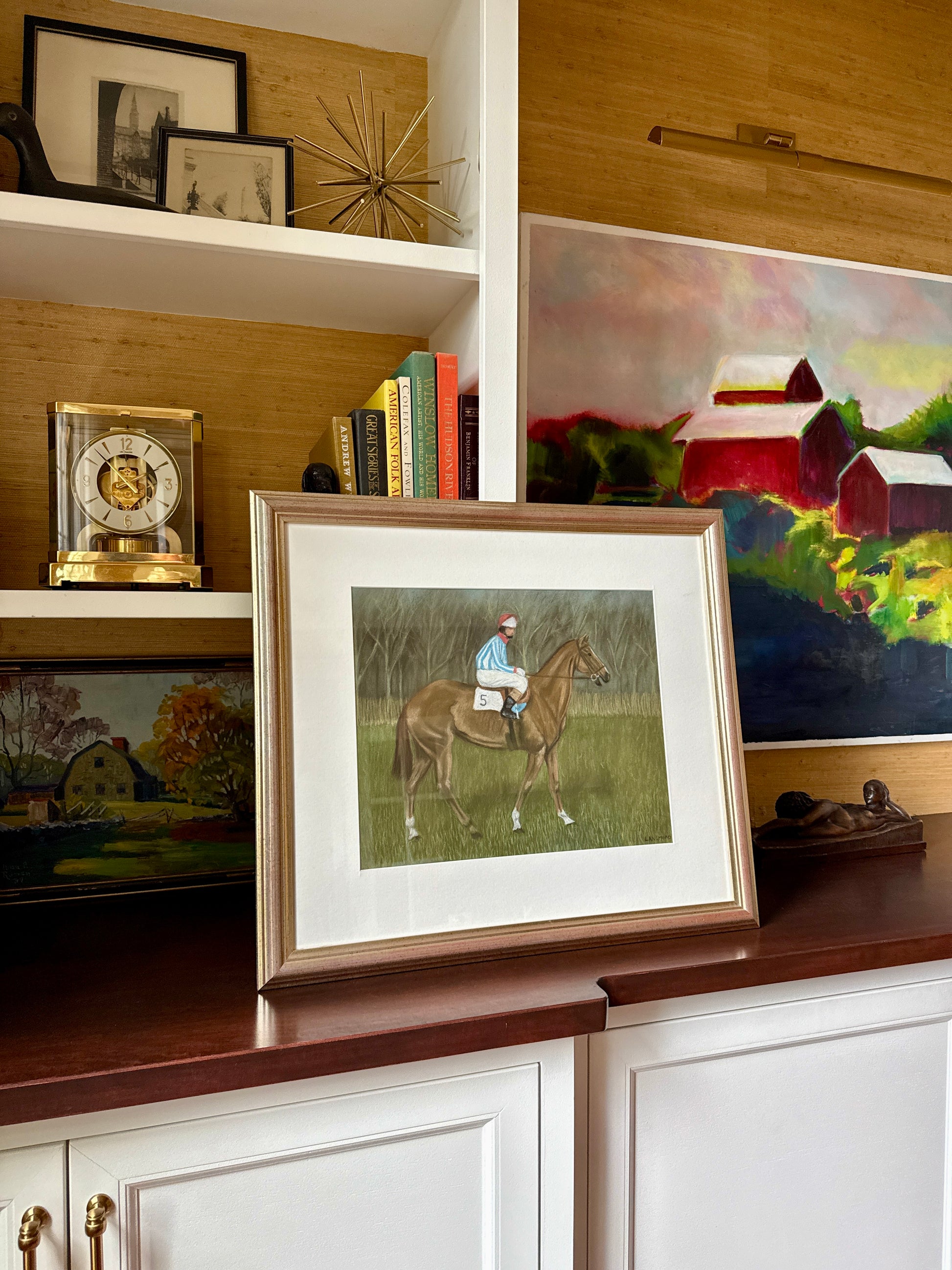Vintage Jockey in Blue and White Striped Silks on Horse Pastel in Silver Frame