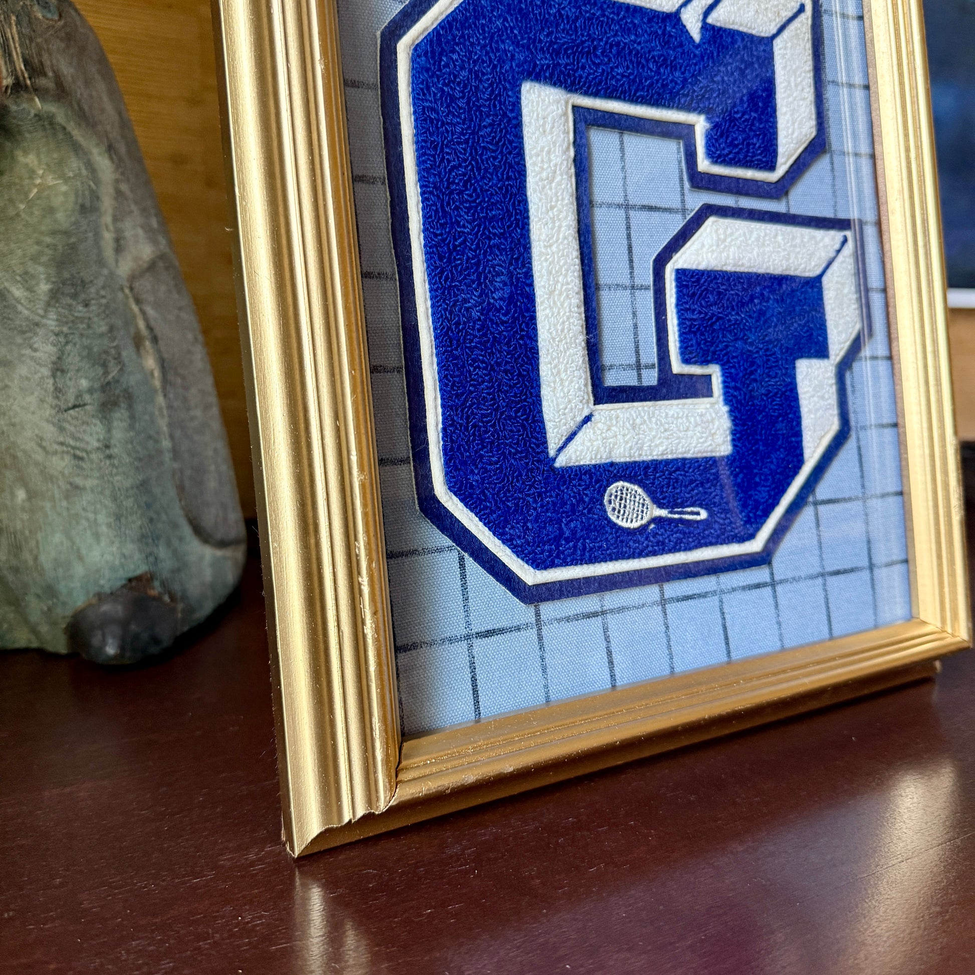 Vintage blue and white varsity tennis team letter "G" mounted on a blue windowpane checked fabric. Letter in thick, vintage gold wood frame measures 12.75" x 10.75”. Mounted under glass. Frame in very good, vintage condition with light wear.