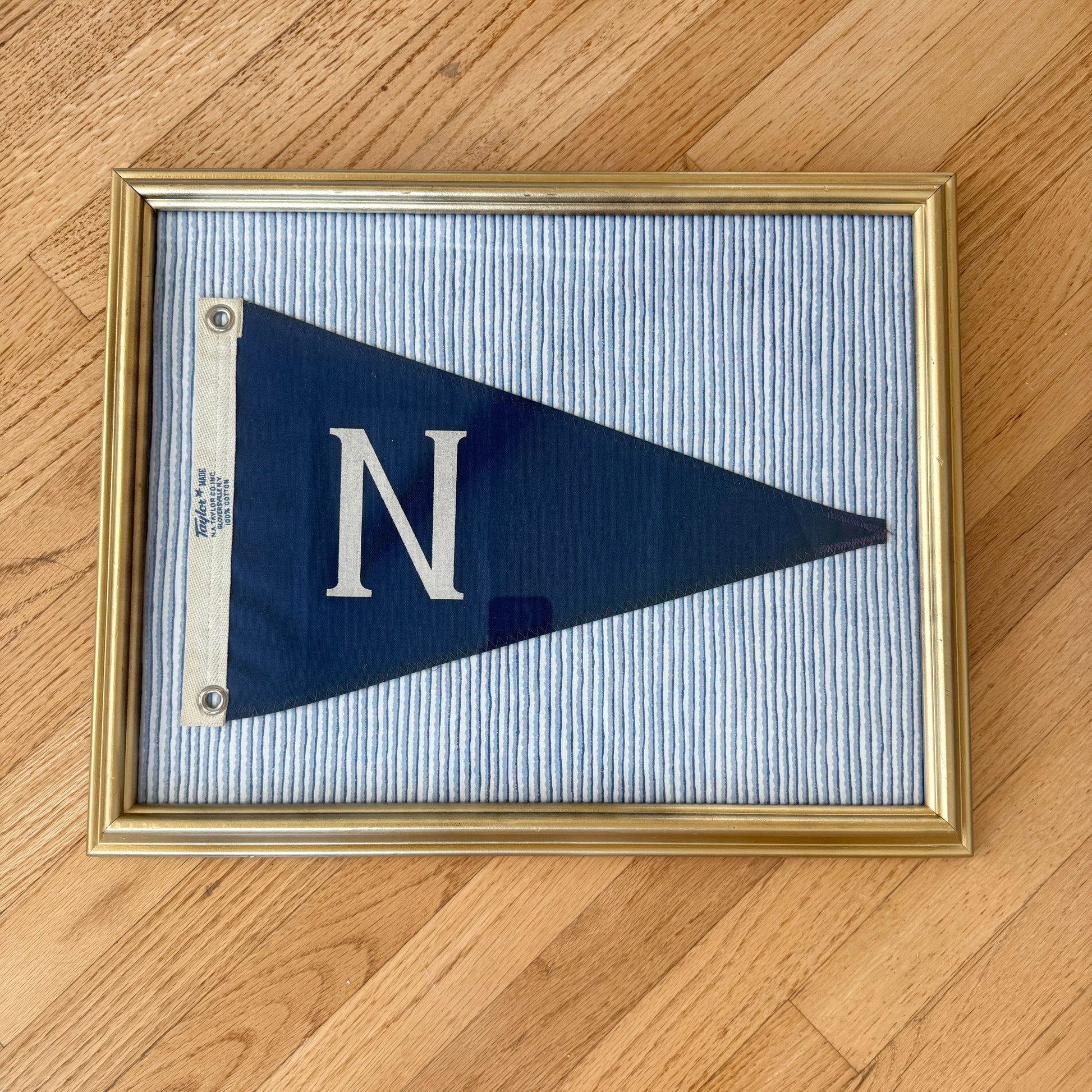 Vintage Taylor Made "N" burgee nautical flag mounted on blue wavy striped fabric. Flag in vintage, gold finish wood frame measures 16" x 20". Under glass. Flag in good condition with light patina. Frame in good, vintage condition with light wear.