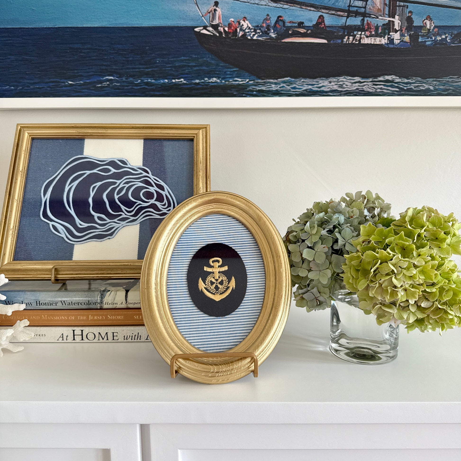 Vintage Navy Wool Anchor Patch on Blue Ticking Stripe in Gold Oval Frame