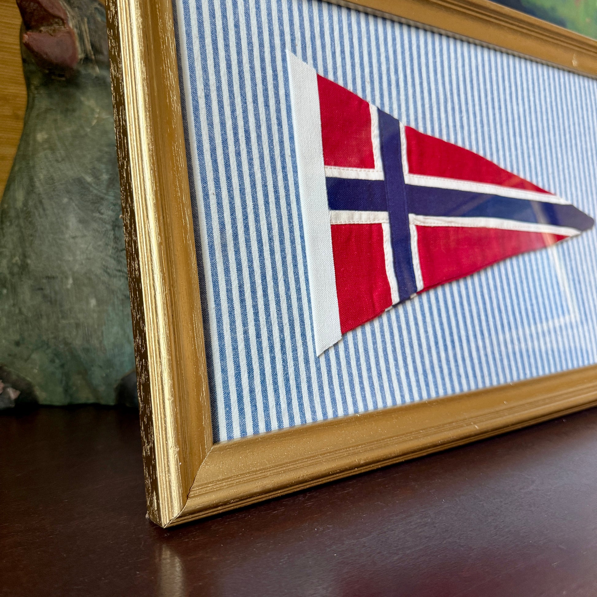 Vintage red and white cotton canvas pennant of Norway on blue and white ticking striped fabric. Flag in vintage gold finished wood frame measures 10.5" x 16.5", and is glass. Flag has light patina. Frame in very good, vintage condition with light wear. Coordinating flags in last photo are available in separate listings.