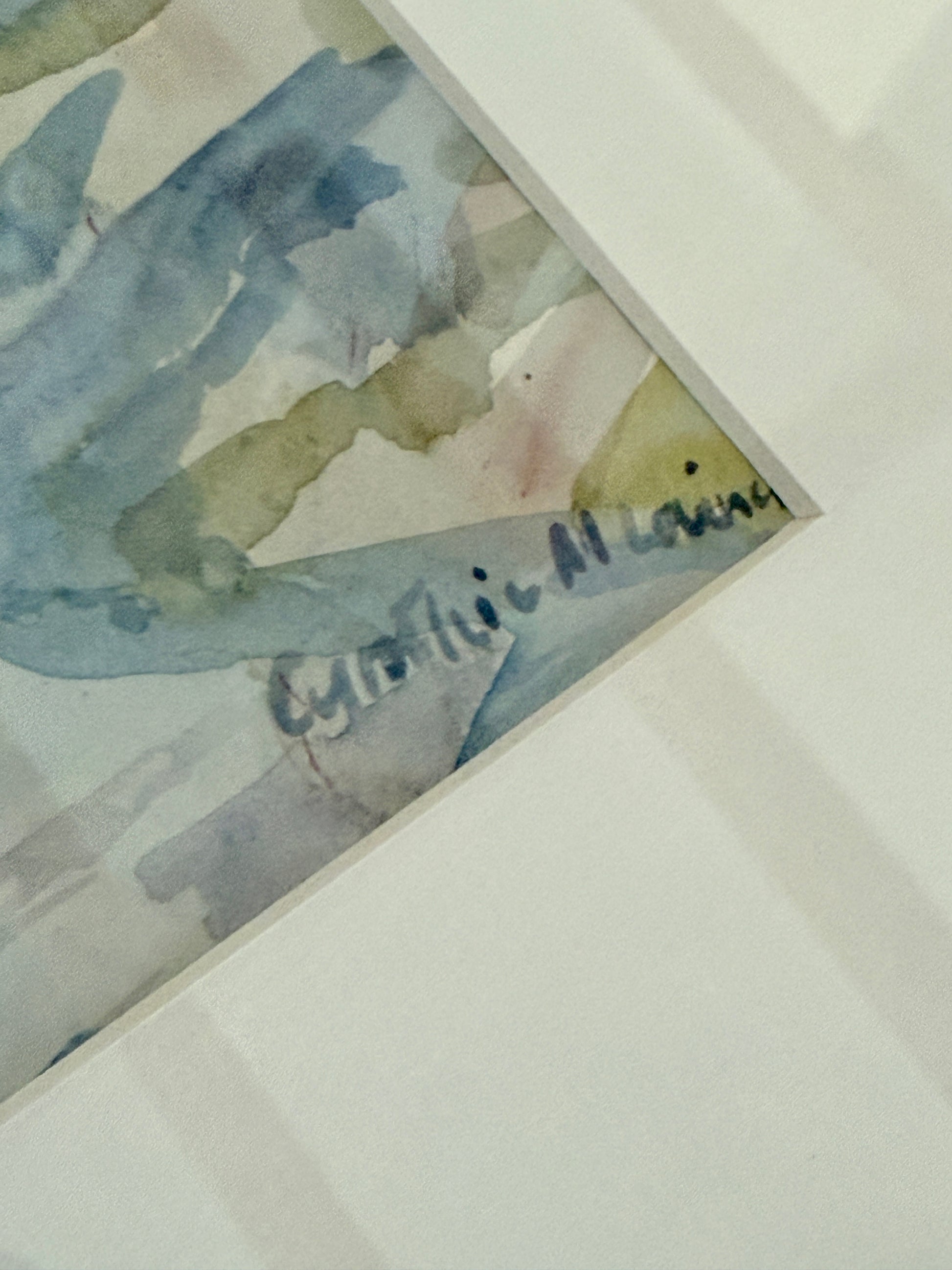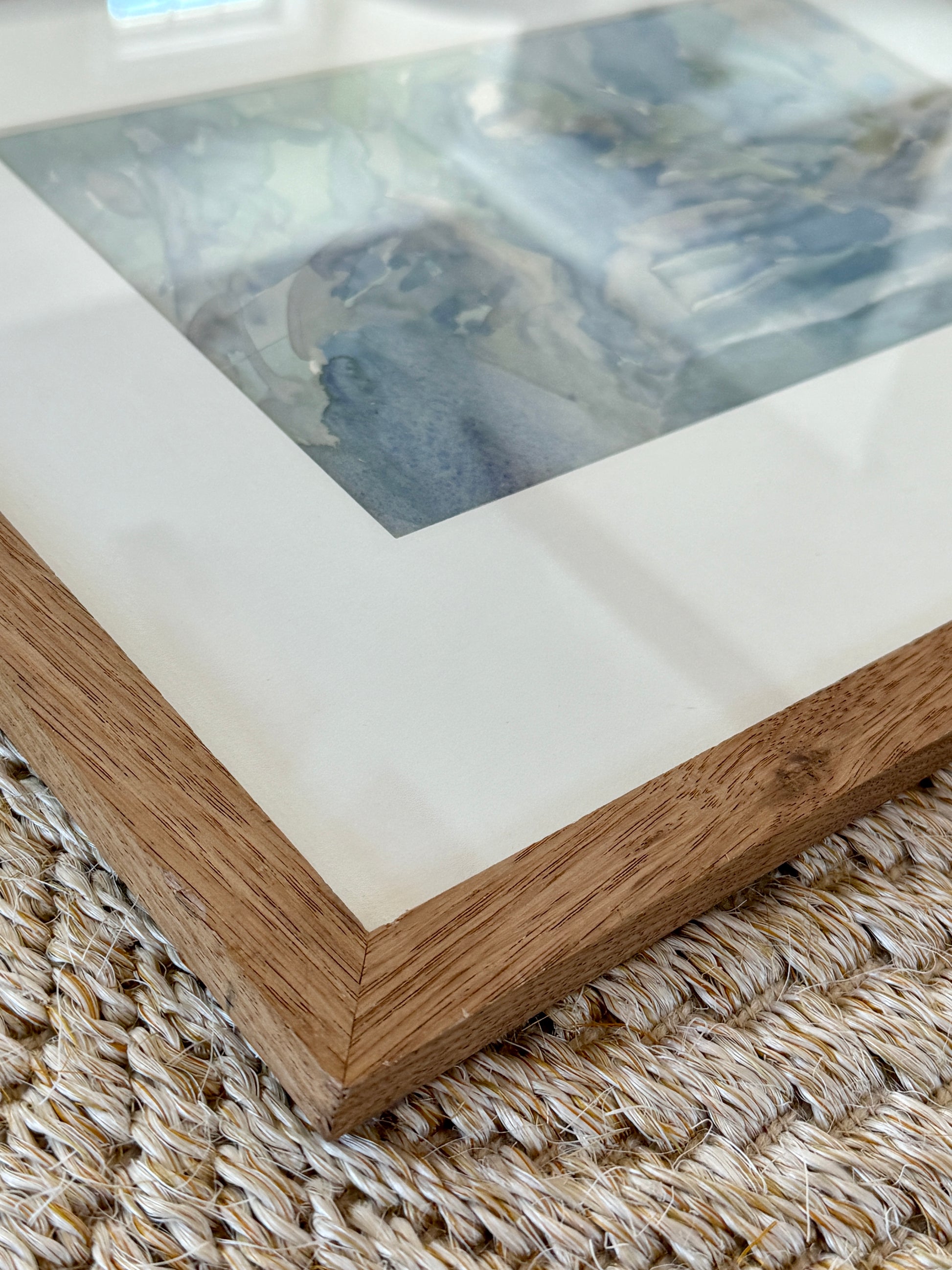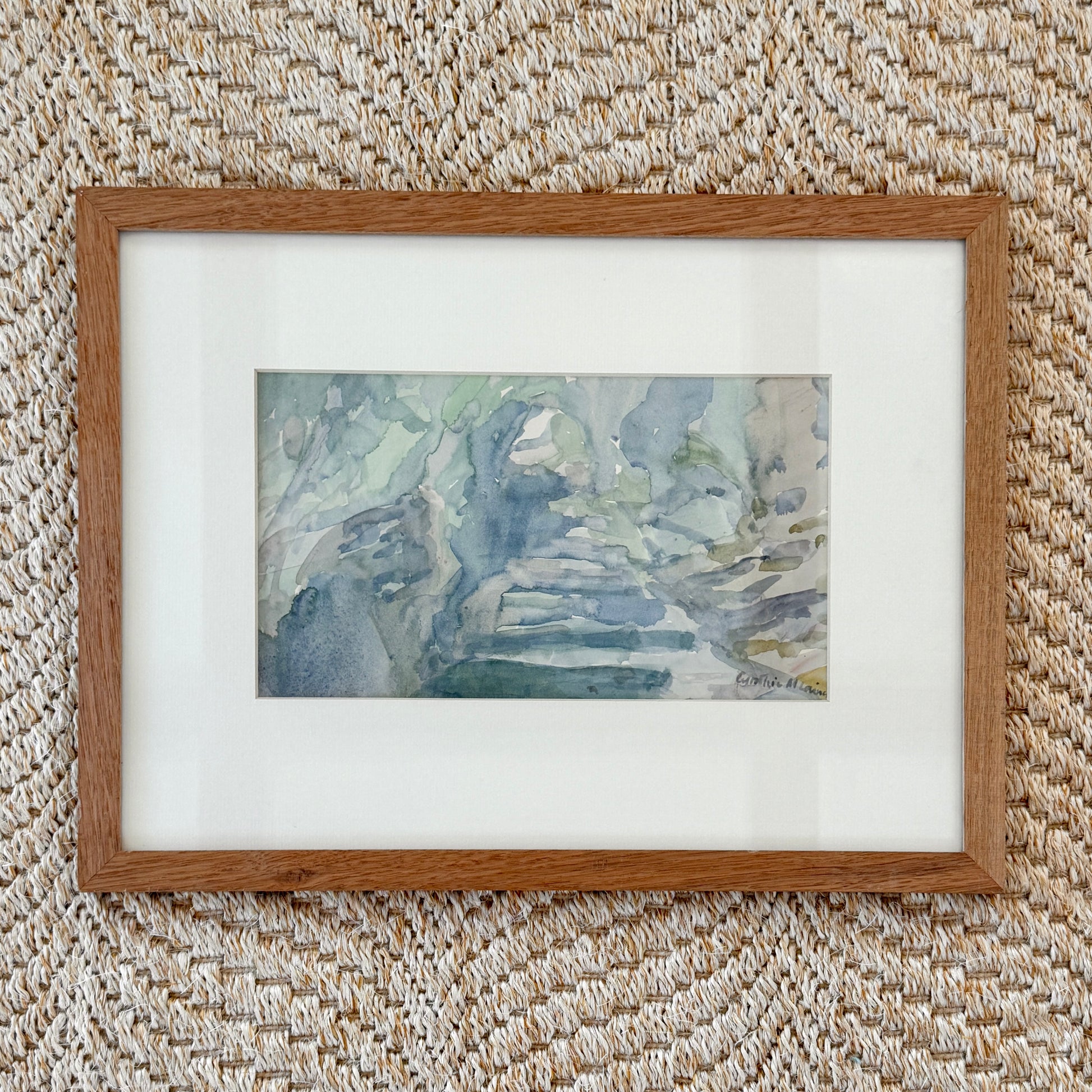 Vintage Semi-Abstract Blue Green Landscapce Watercolor Painting in Wood Frame