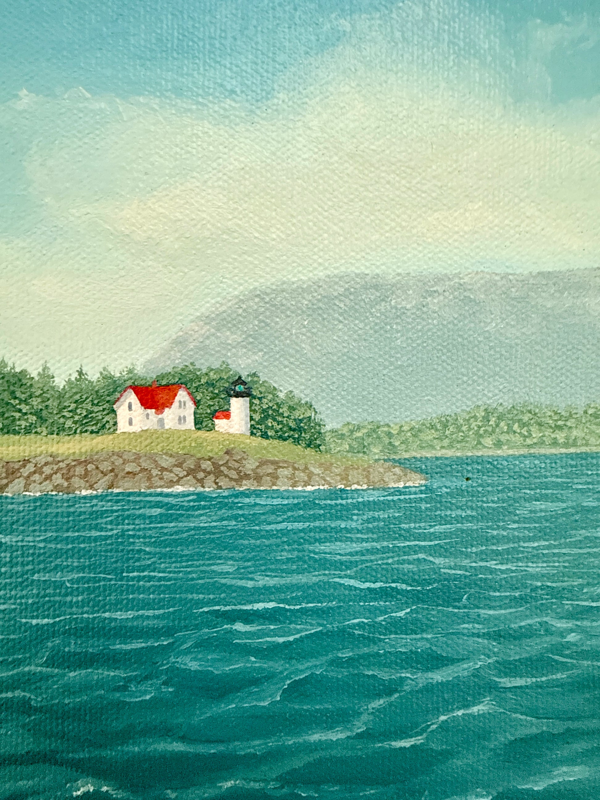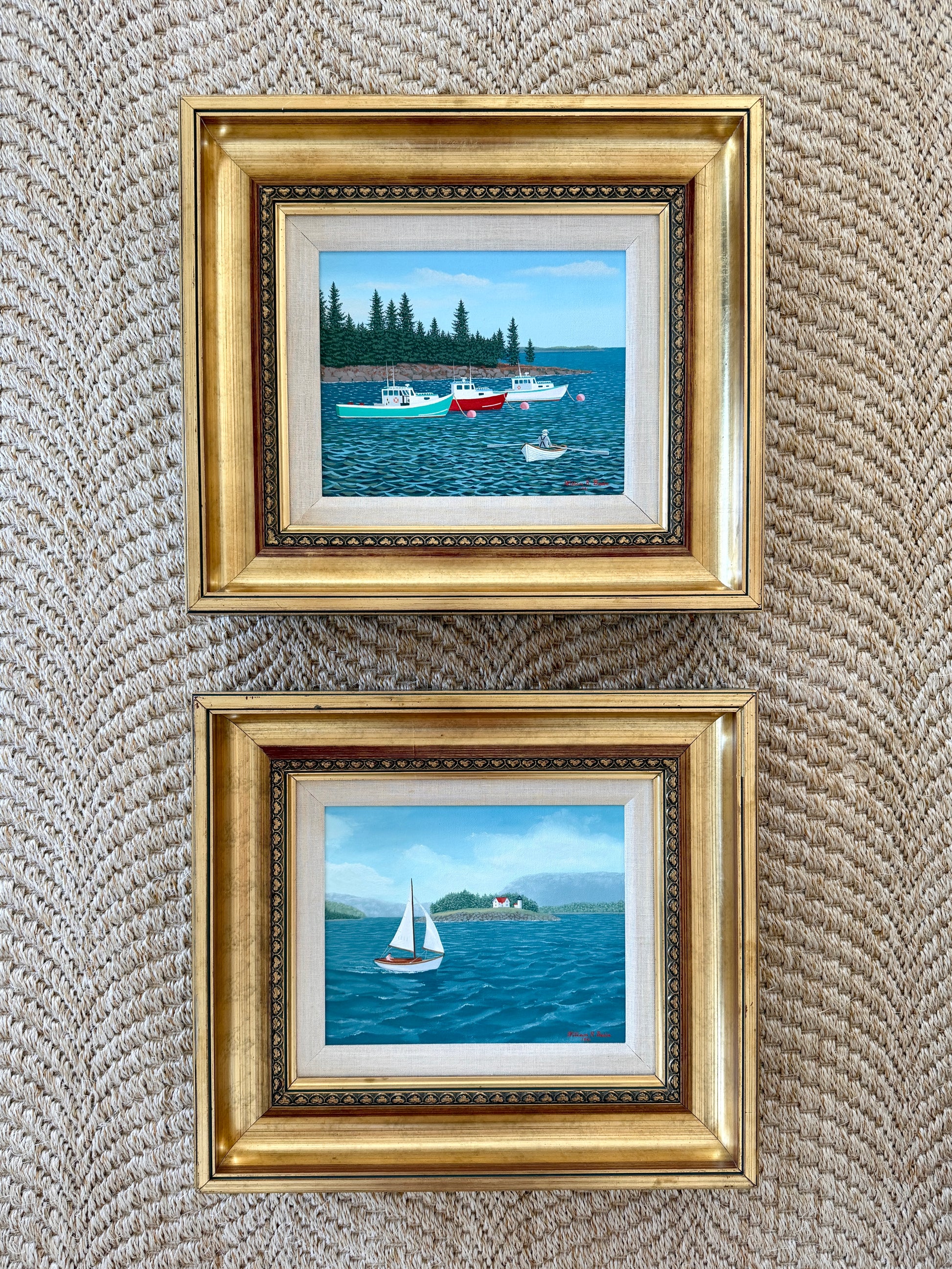 William Beebe (American, b. 1956) oil painting on canvas of a sailboat in a seascape surrounding Curtis Island. Curtis Island is an island located in the exterior of Camden Harbor, in Camden, Maine. Signed and dated 1991 at lower right. Label from Bayview Gallery of Camden and Portland, ME on the reverse. Beebe has exhibited extensively throughout New England and the American South. His paintings are in major private and corporate collections in the United States and abroad. His Maine paintings have been featured in several publications including American Art Review and a book entitled The Art of Monhegan Island. William is a member of Oil Painters of America and the Charleston Artist Guild. William Beebe Artwork in custom gold wood frame with linen liner measures 14.75" x 16.5". Artwork and frame in very good condition with light wear. Coordinating artwork shown is available in a separate listing.